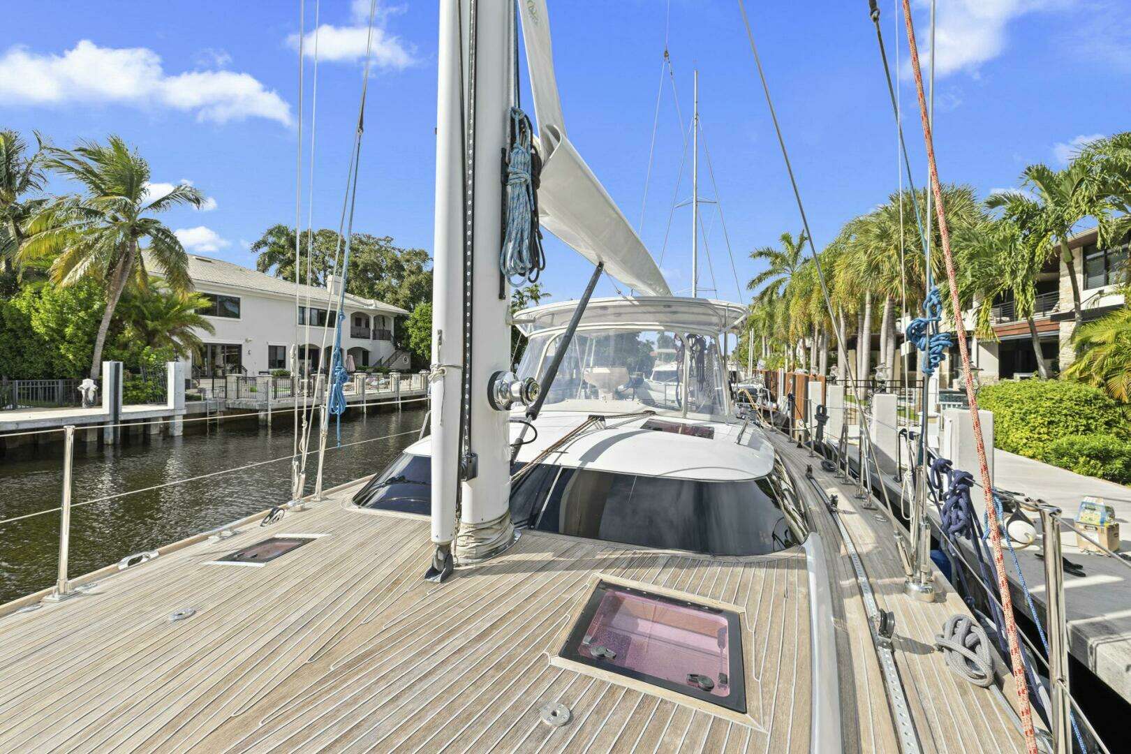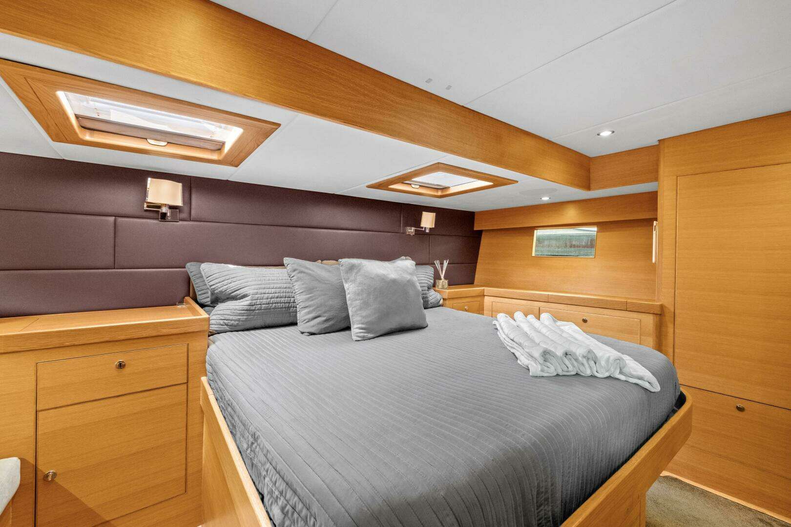 - 4 cabins and 3 heads: Full-beam master aft cabin, Queen walkaround in V berth, port twin crew single berth