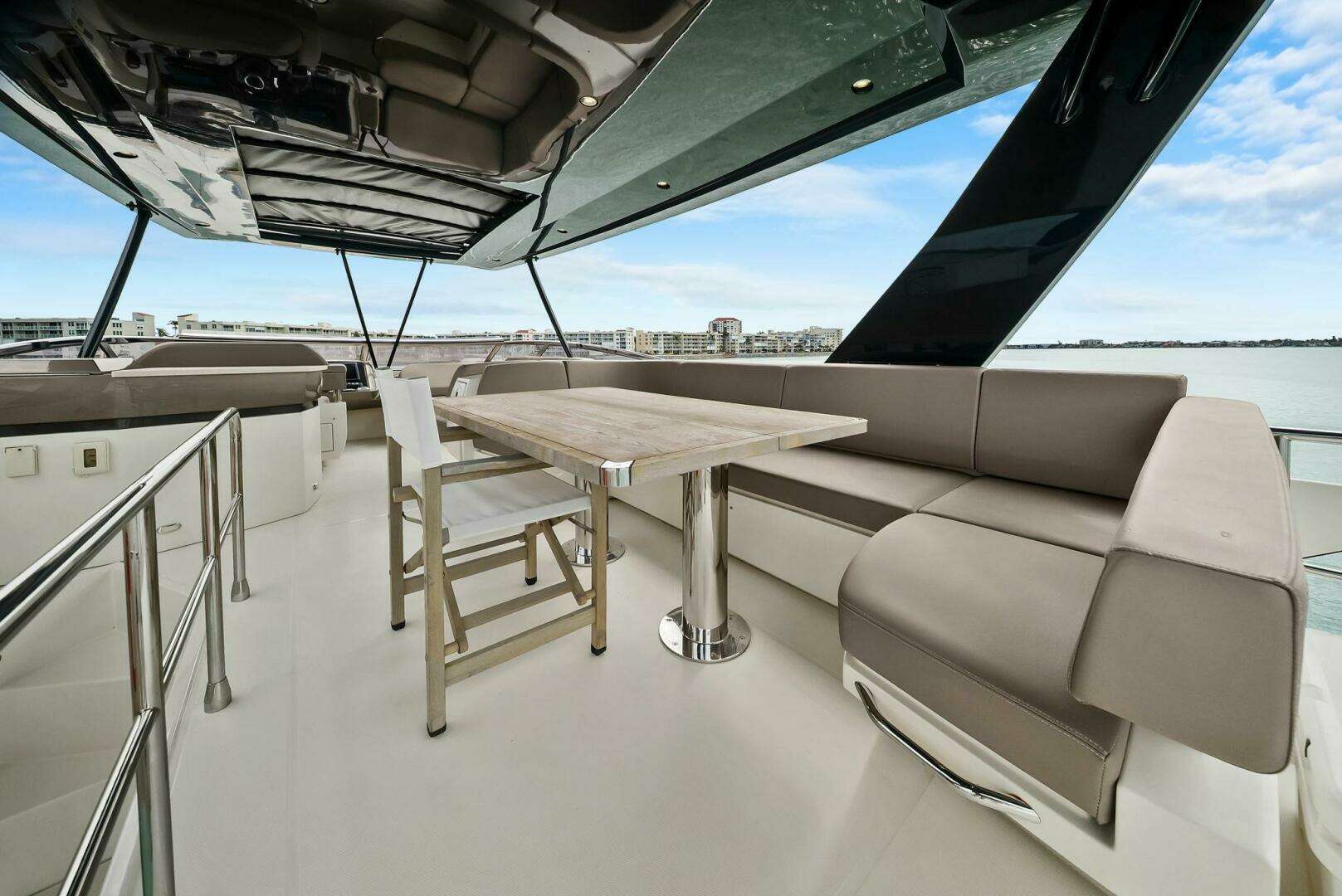 The flybridge is designed for both relaxation and command, offering expansive seating, a wet bar, and an upper helm station with excellent visibility. The cockpit and swim platform provide easy water access, making the vessel equally suited for cruising or entertaining at anchor.