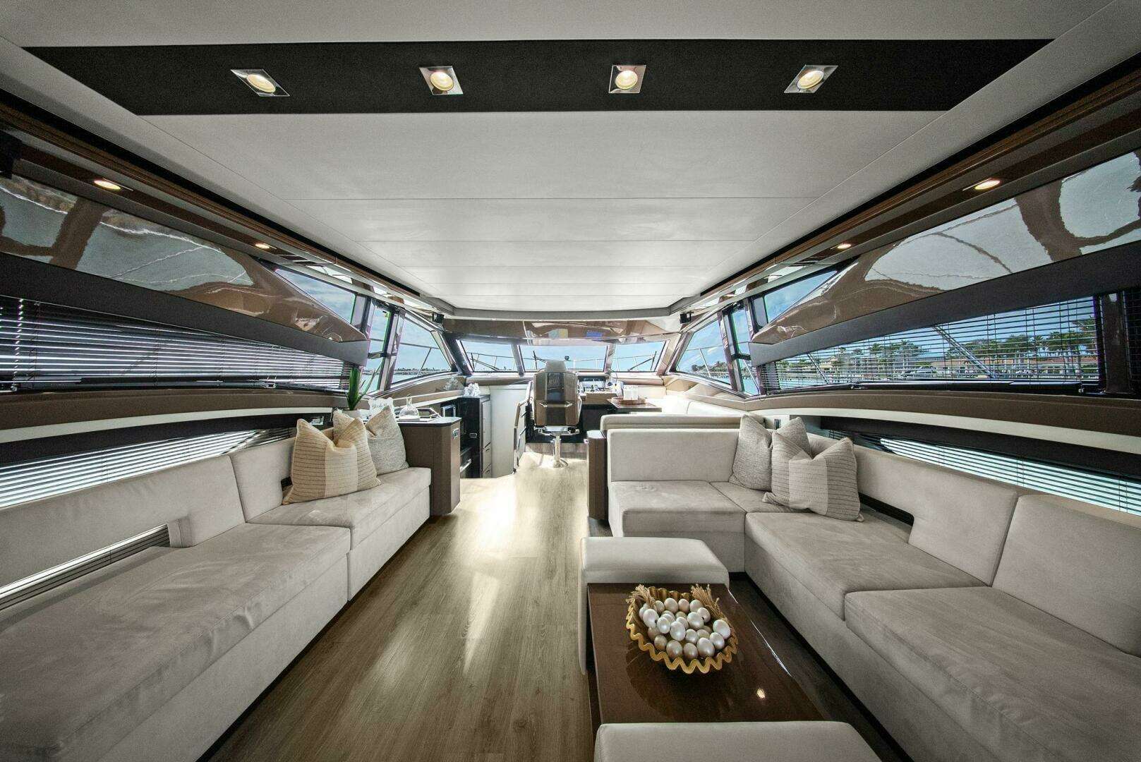 The main salon is bright and open, featuring panoramic windows, high-gloss cabinetry, premium stone surfaces, and generous seating ideal for entertaining or extended cruising. The galley is thoughtfully integrated into the main deck layout, providing functionality without compromising flow.