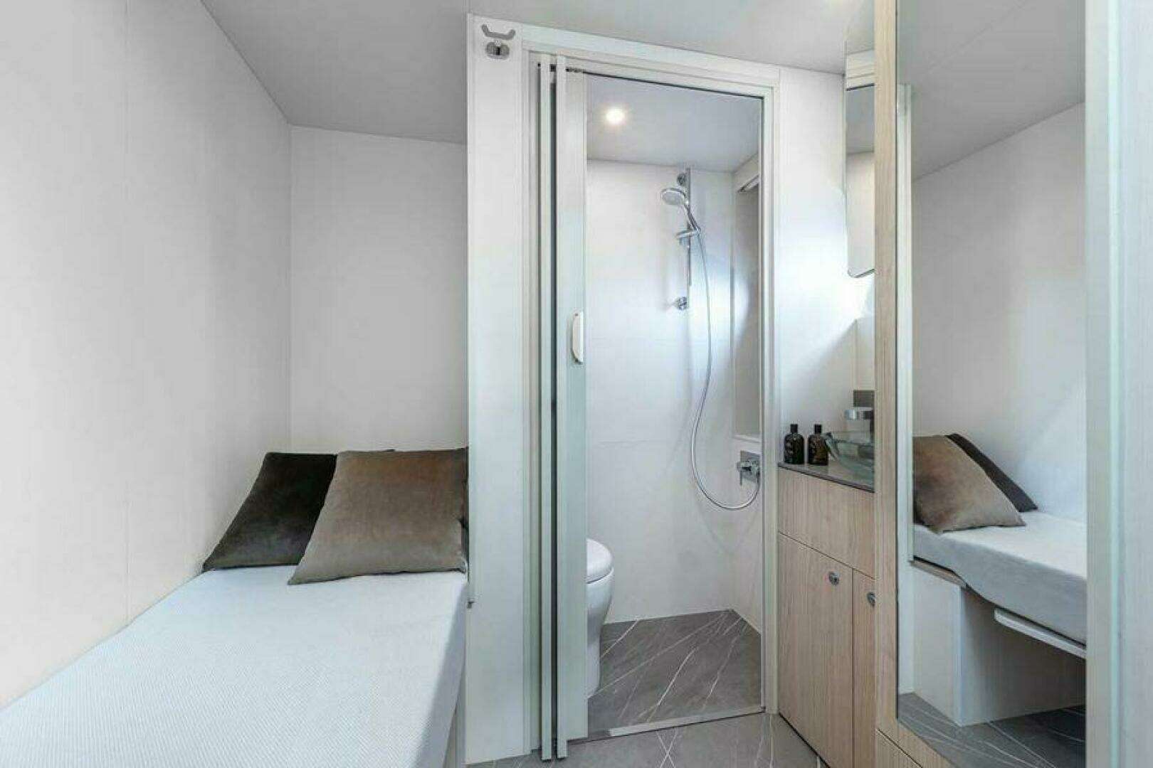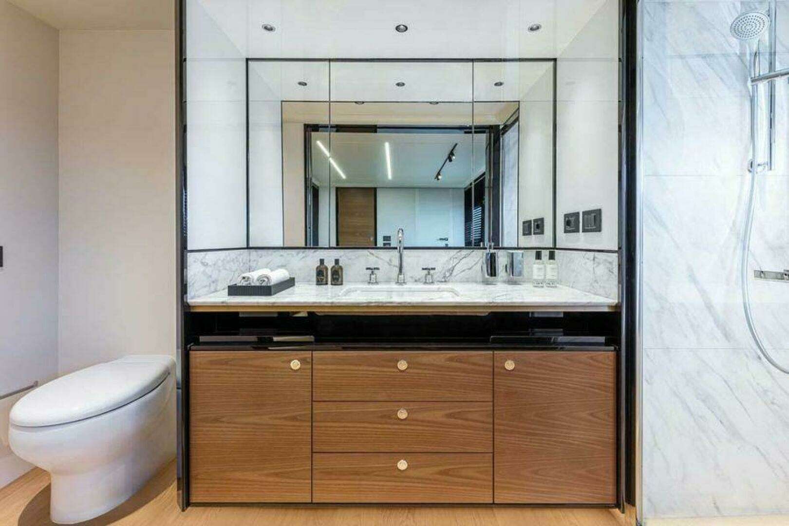 Inside, the atmosphere reflects understated luxury. Minotti leather salon sofas, dining chairs, and armchair pair with a marble salon table for a sophisticated entertaining space. Electric and roller blinds, heated towel racks, washer and dryer units, premium audio packages, KVH TV7 satellite television with multiple receivers, and WiFi 4G connectivity ensure modern convenience throughout. Tropical air conditioning rated at 110,000 BTU maintains comfort in warm climates, supporting extended cruising in total ease.
