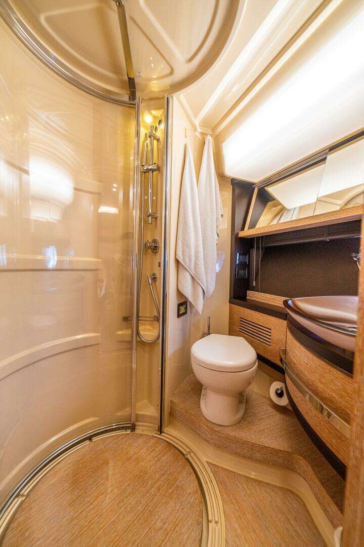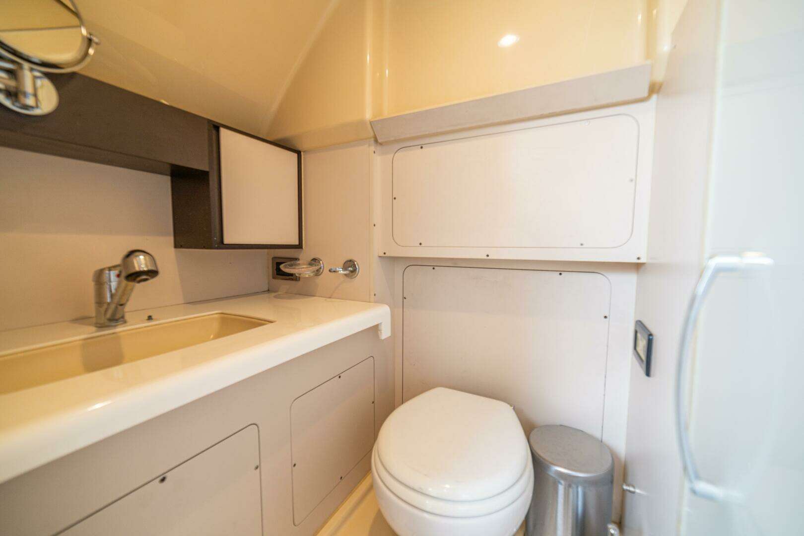 - Ensuite head compartment with marine toilet, window with privacy blinds, and storage cabinetry