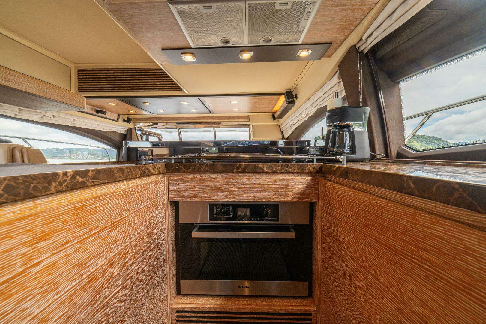The galley is modern and well-appointed, featuring high-quality finishes and appliances, designed for functionality and elegance.