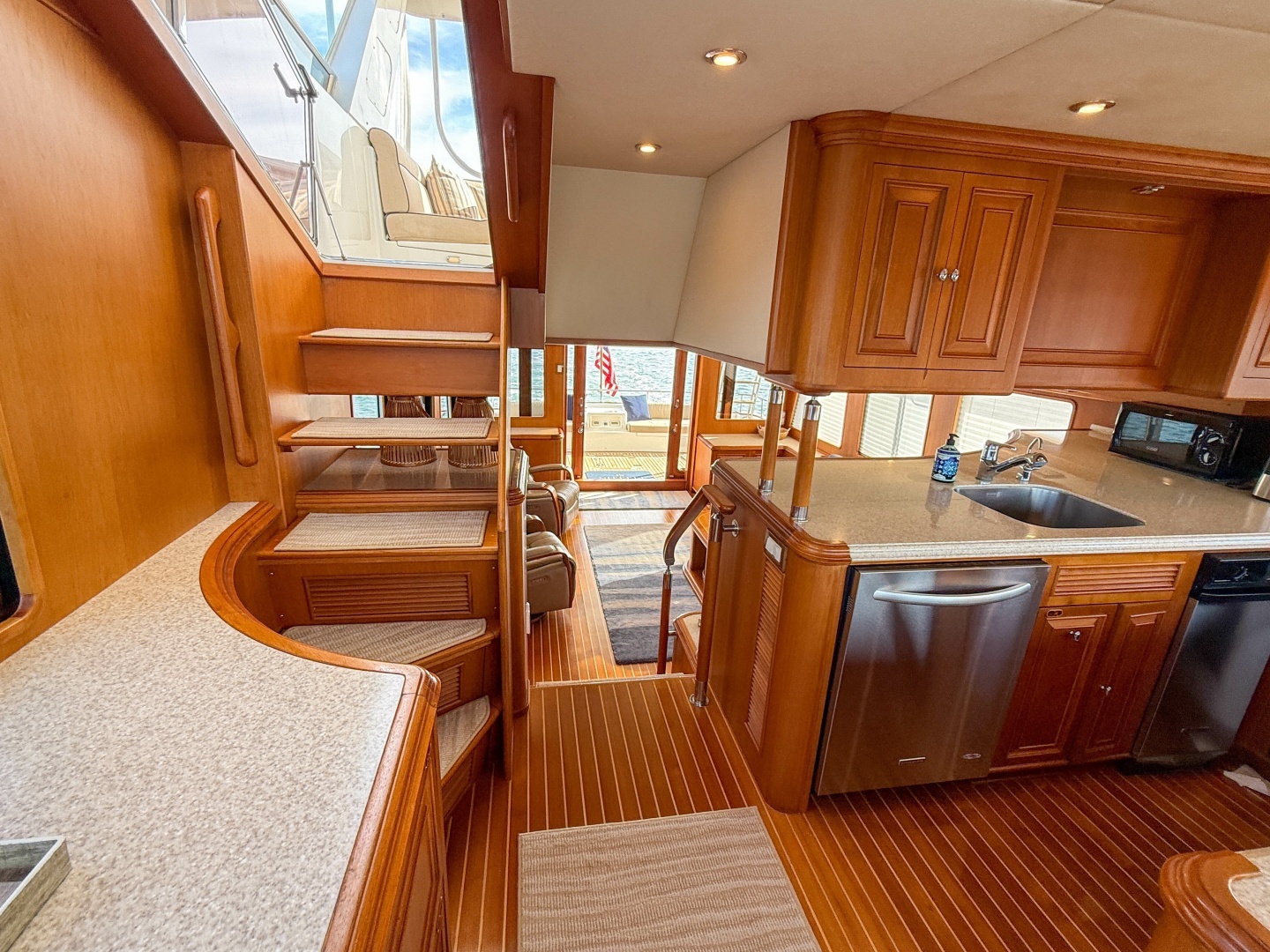 - Flybridge helm is centerline with access to main deck to starboard