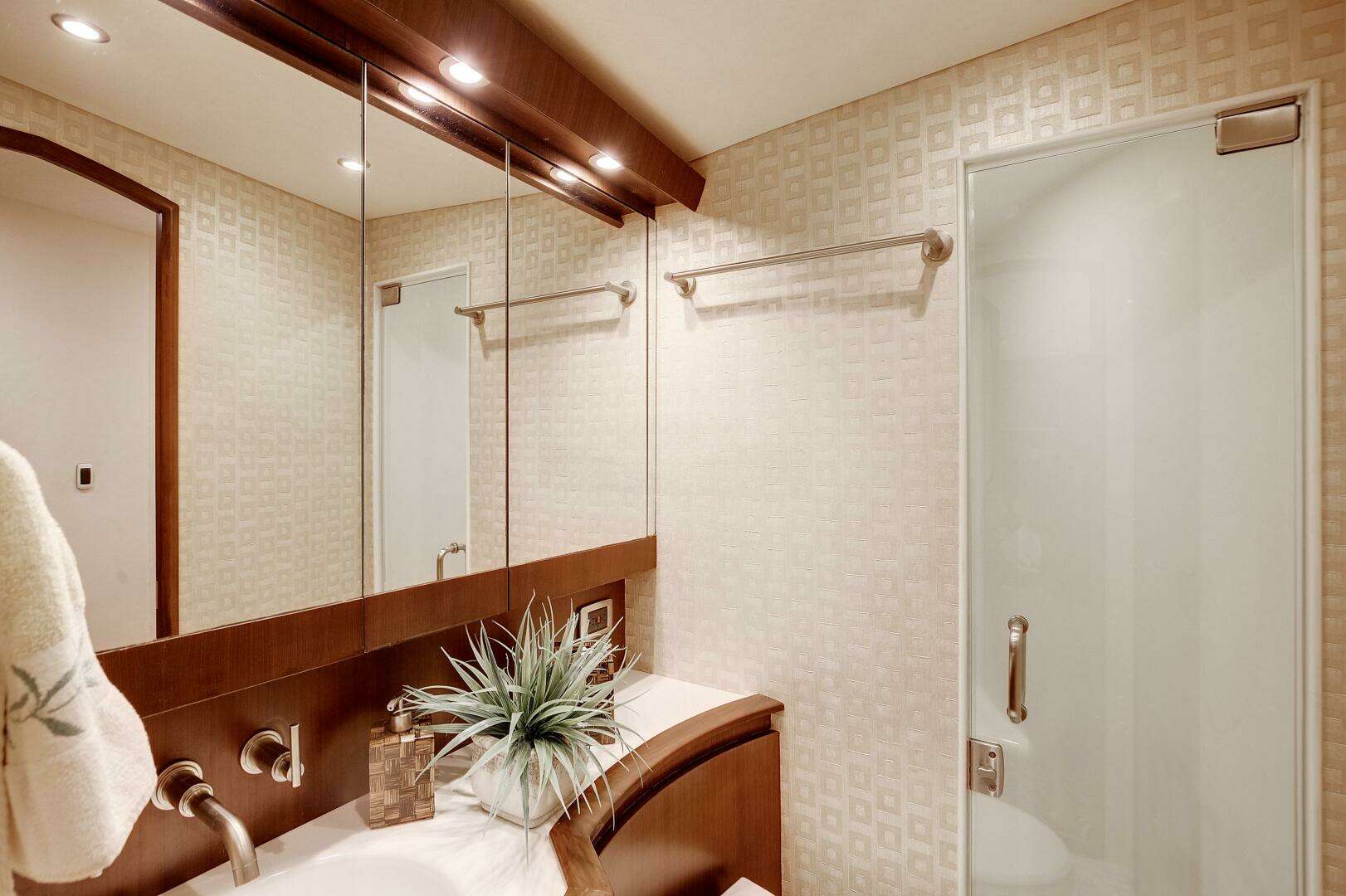 - Crew head with fiberglass shower & glass door, granite countertop, custom tile flooring, mirrored medicine cabinet