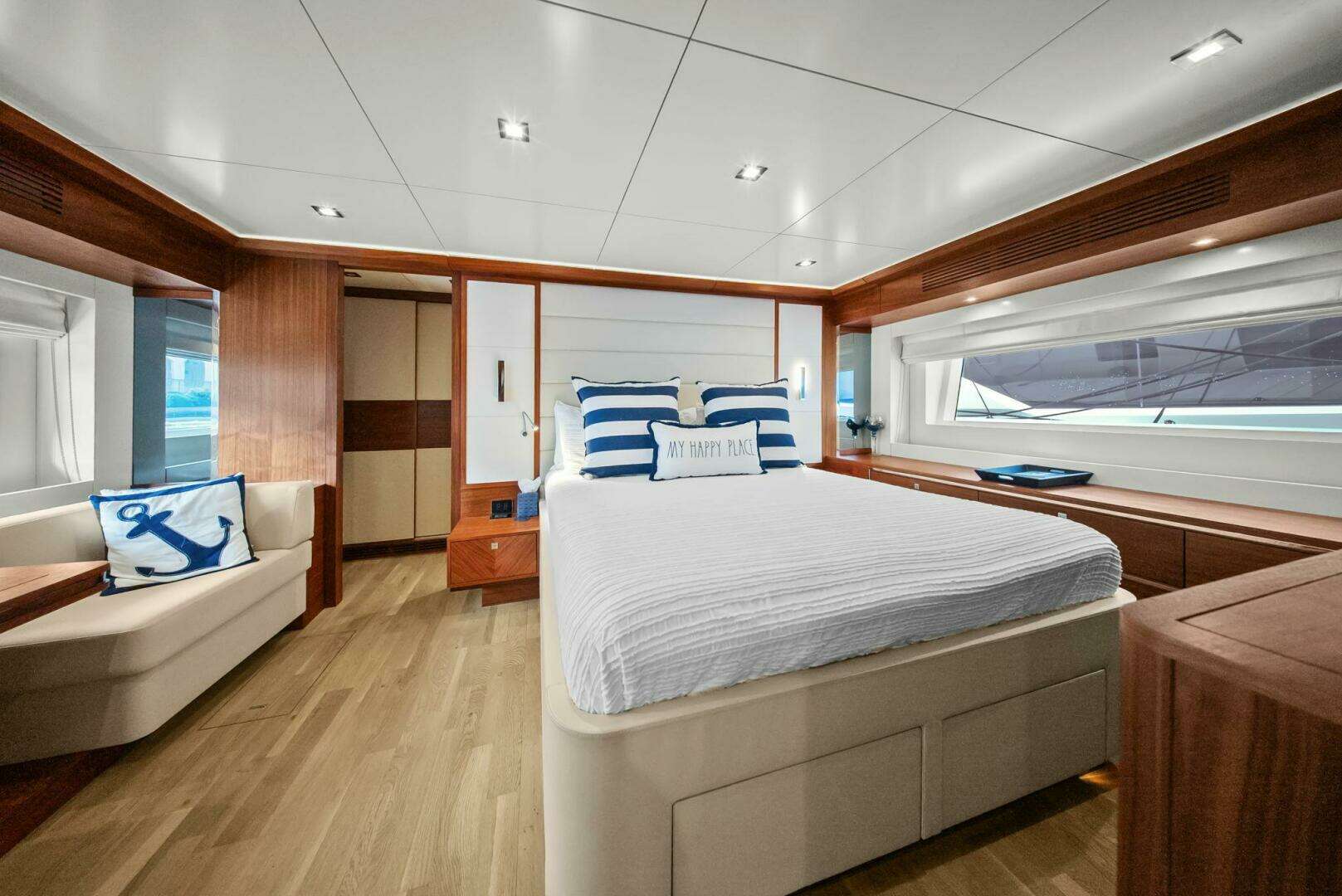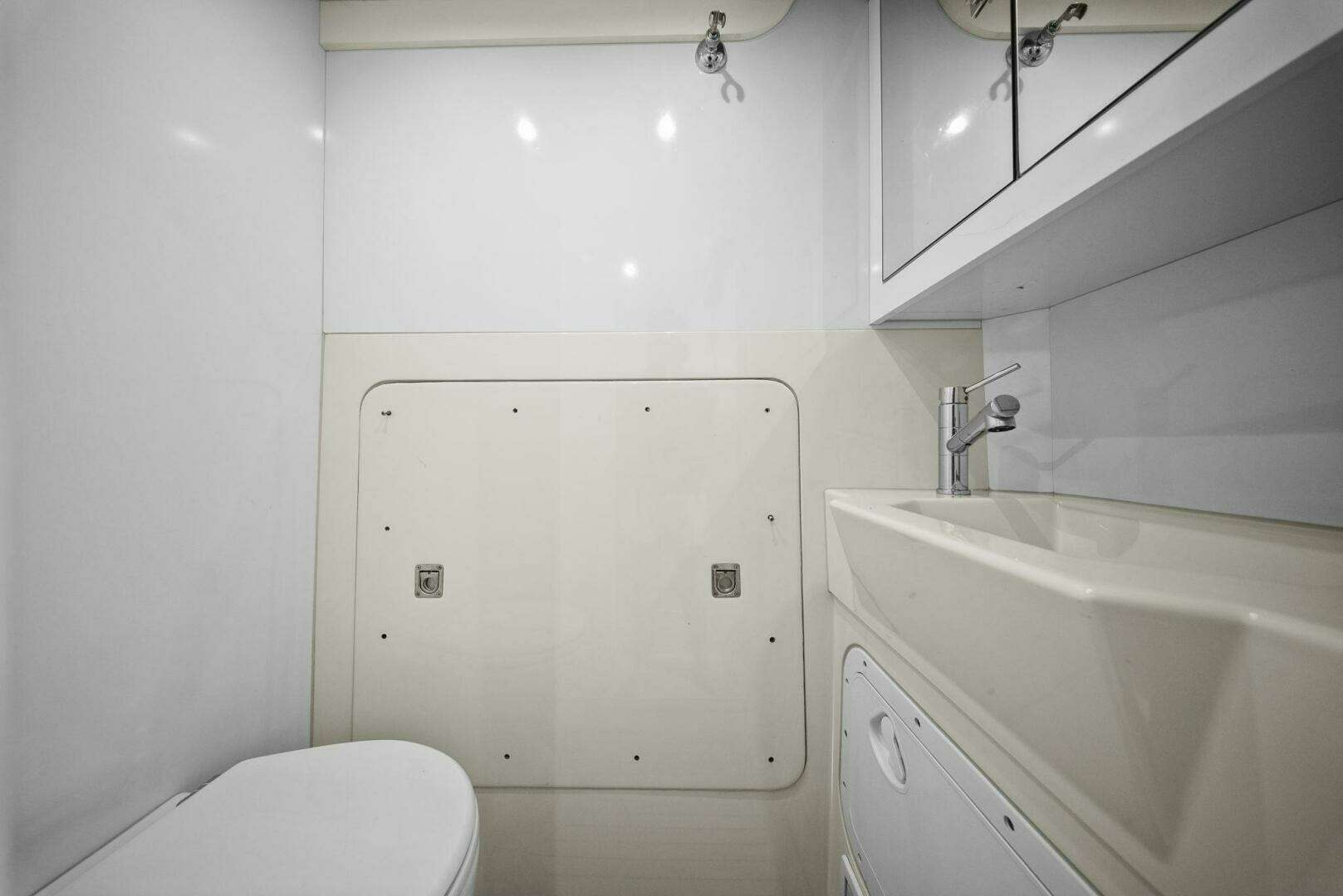 Below deck, the full-beam master stateroom includes a private ensuite with dual vanities and a separate shower. A forward VIP and port guest cabin each offer private or semi-private heads, ensuring comfortable accommodation for up to six guests. Aft, a crew or utility cabin provides flexible storage or additional sleeping quarters with separate access.