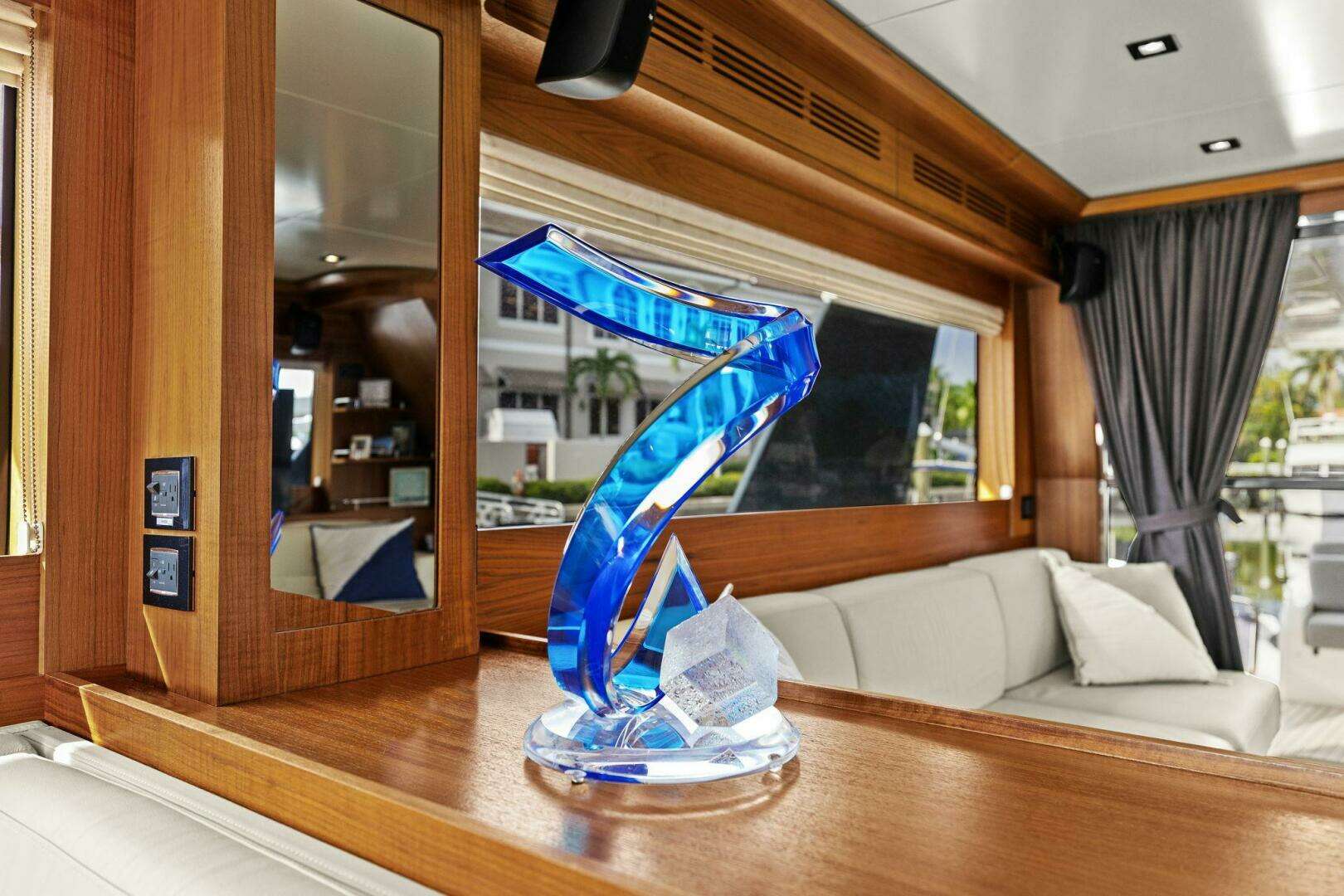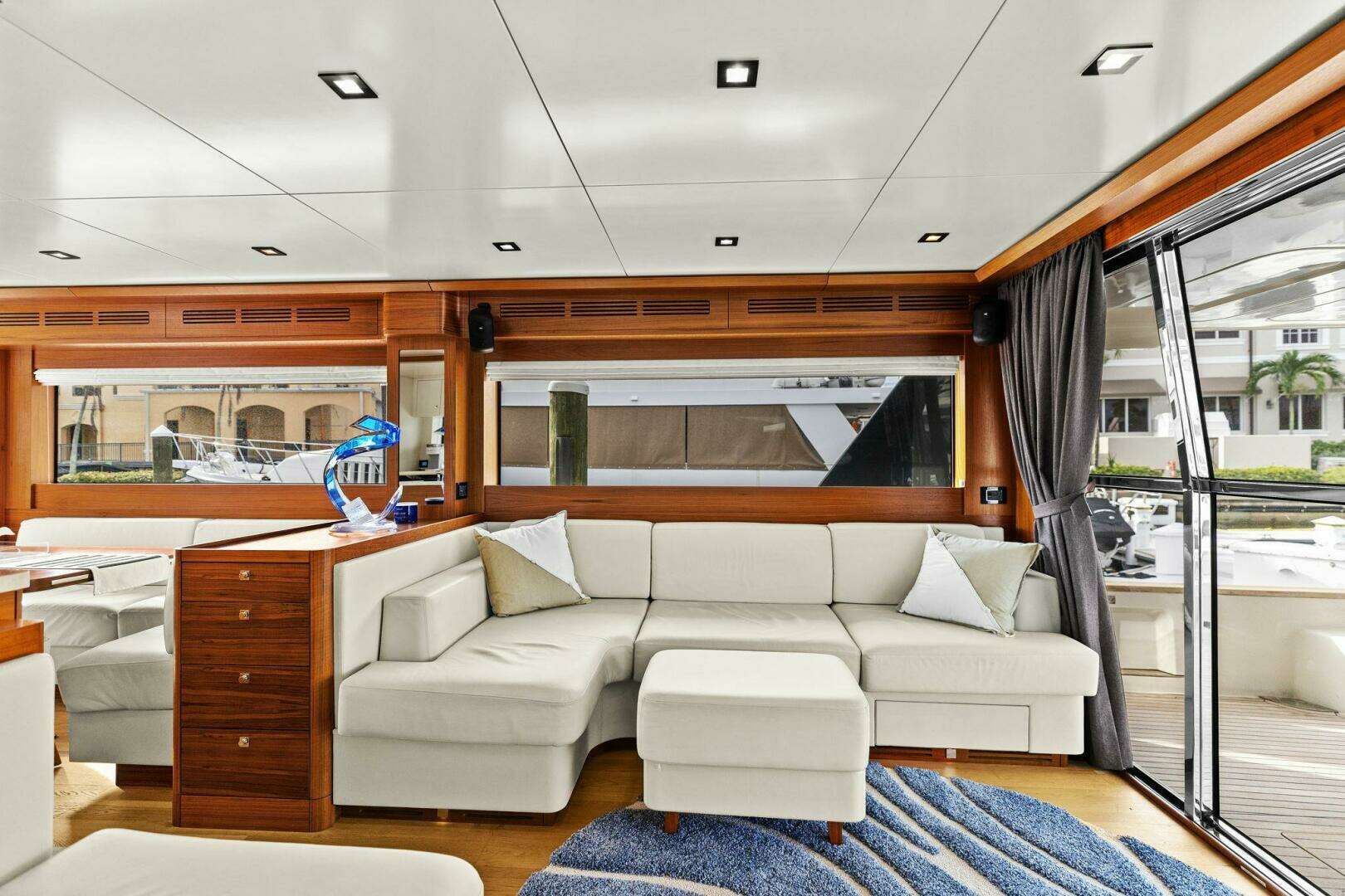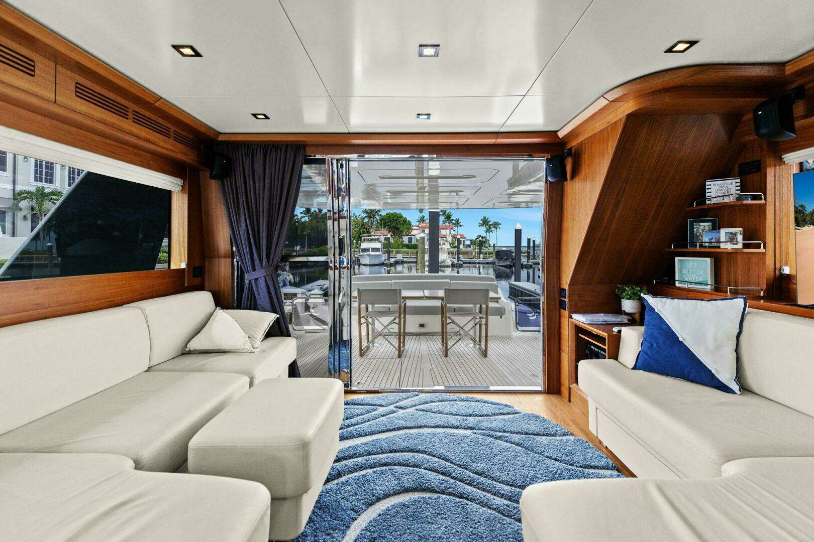 Boarding from the hydraulic swim platform, wide teak steps lead to a generous aft deck with a high-gloss dining table, seating for six, and easy access to both the flybridge and engine room. The open layout flows seamlessly into the salon, creating a bright and inviting space ideal for entertaining or relaxing at anchor.