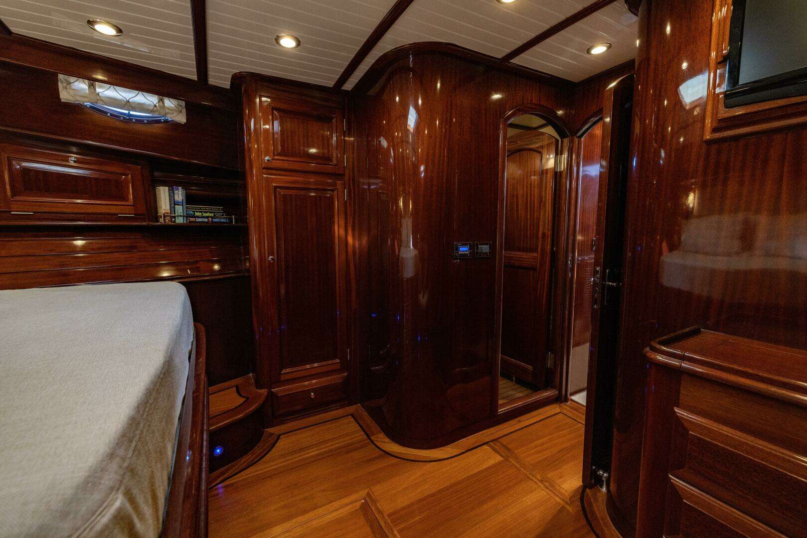 Guest stateroom #2 (VIP) is to port and features two single crisscross berths, a hanging locker, drawer storage, flat screen TV, and a satellite receiver. The master stateroom is all the way forward and features a large queen size bed, port and starboard hanging locker, a vanity, abundant drawer storage and an en-suite head with a large stall shower.