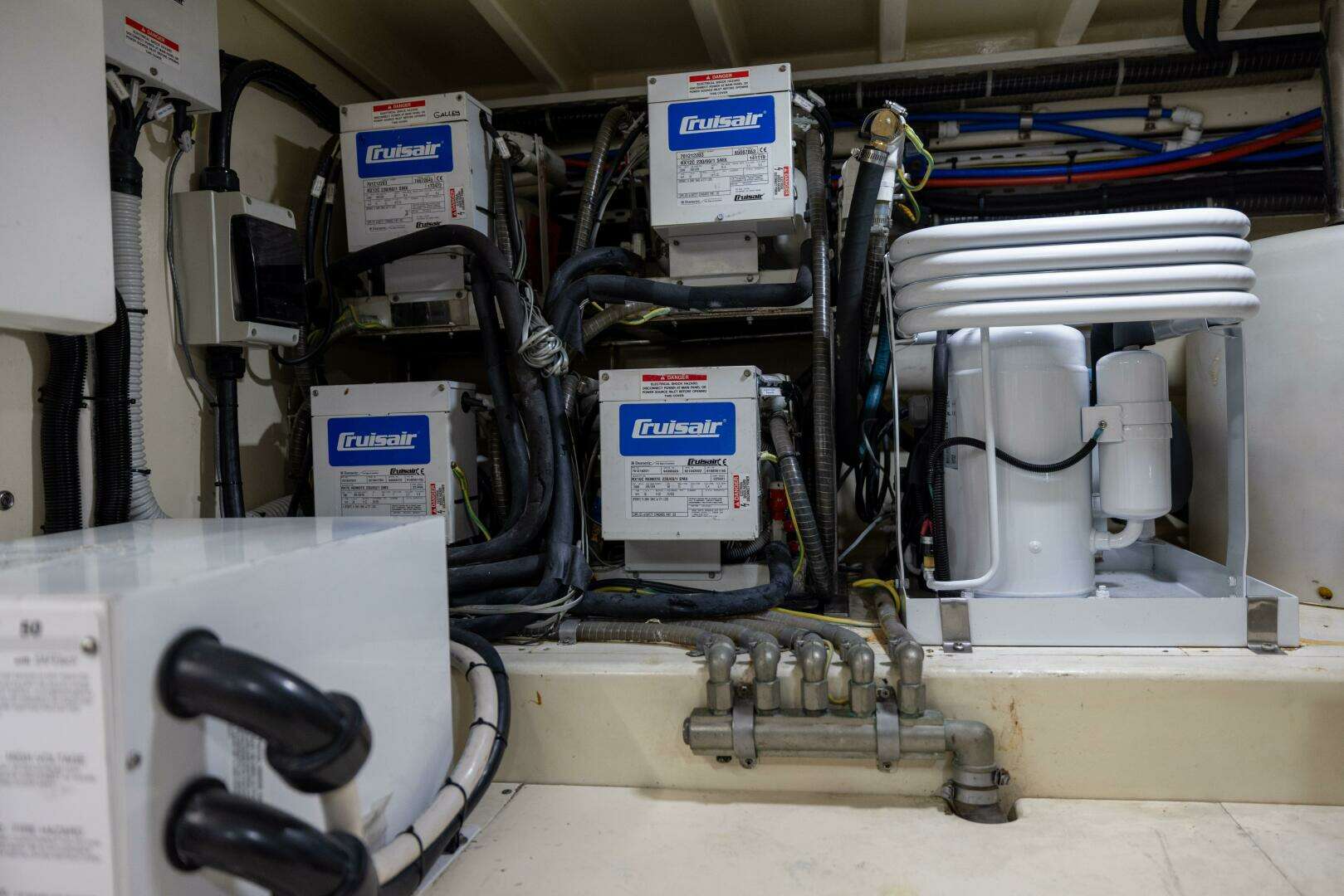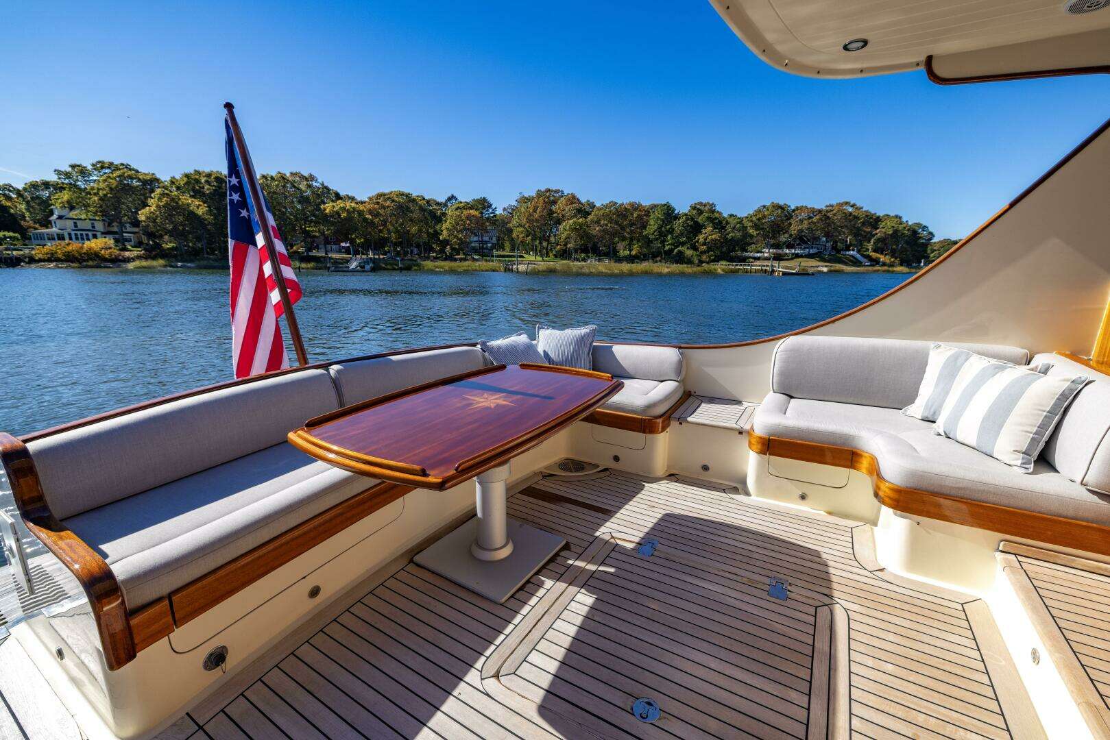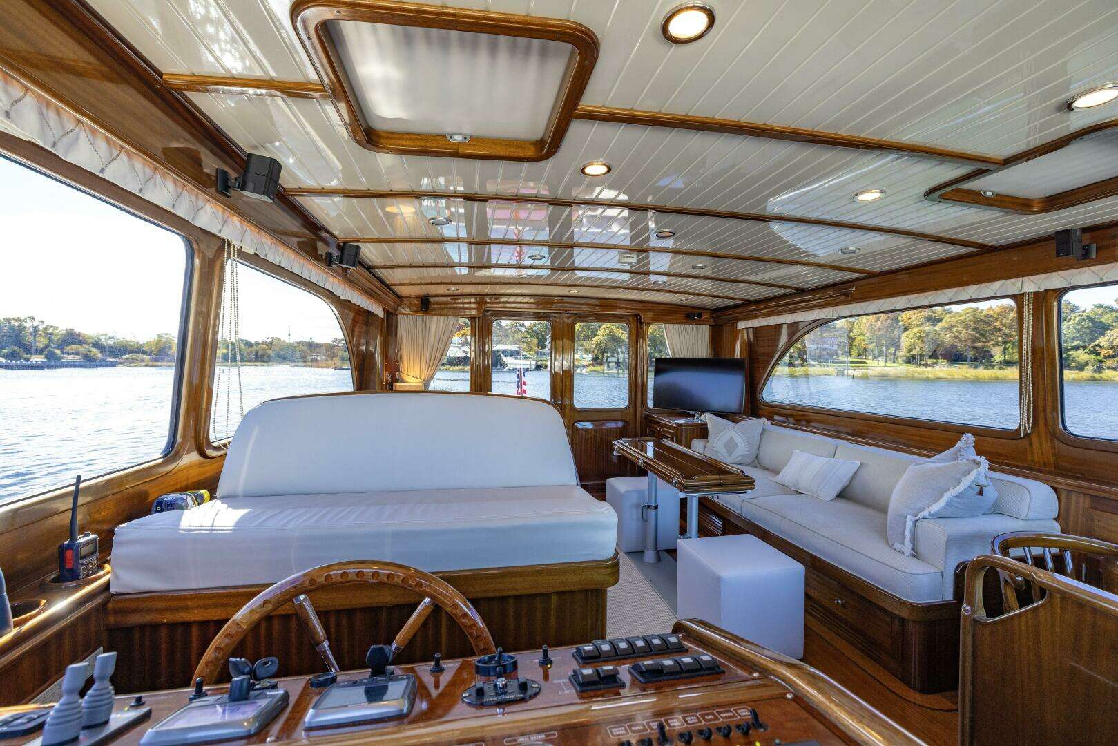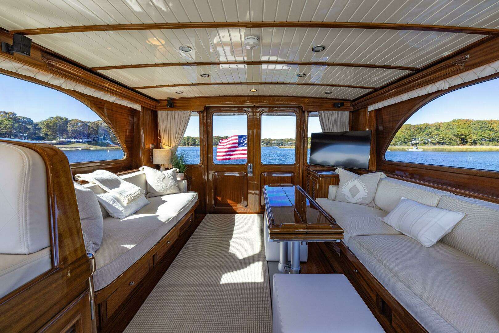 There are two beautiful sofa's port and starboard, a high-glossed Bensenzoni Mahogany high/low table, stereo system, bottle storage, Uline icemaker, and storage everywhere.