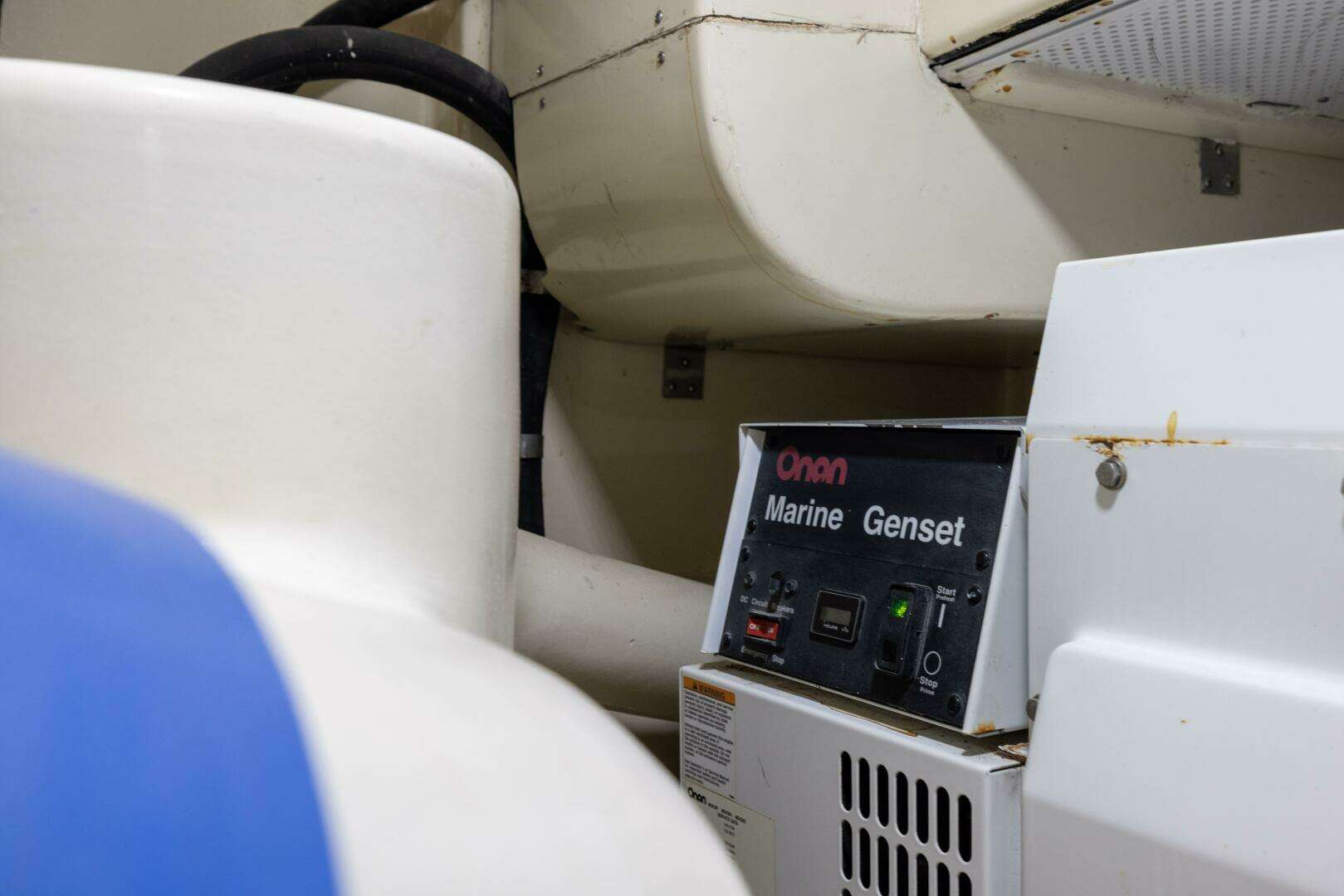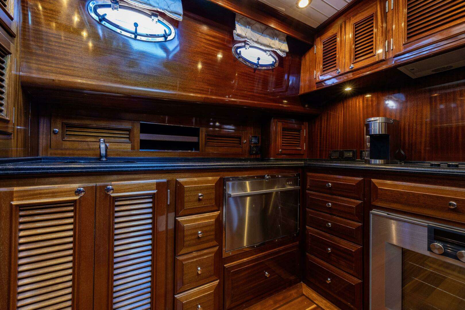 Just four steps down is the galley which has beautiful raised Mahogany and louvered panel doors and drawer storage. There are granite counter tops, two roomy refrigerators and one freezer, a dishwasher, stainless sink and microwave oven. Below the Mahogany floors is an 8 x 2 x 2 storage area allowing you to cast off for an extended trip without restocking for quite a while.