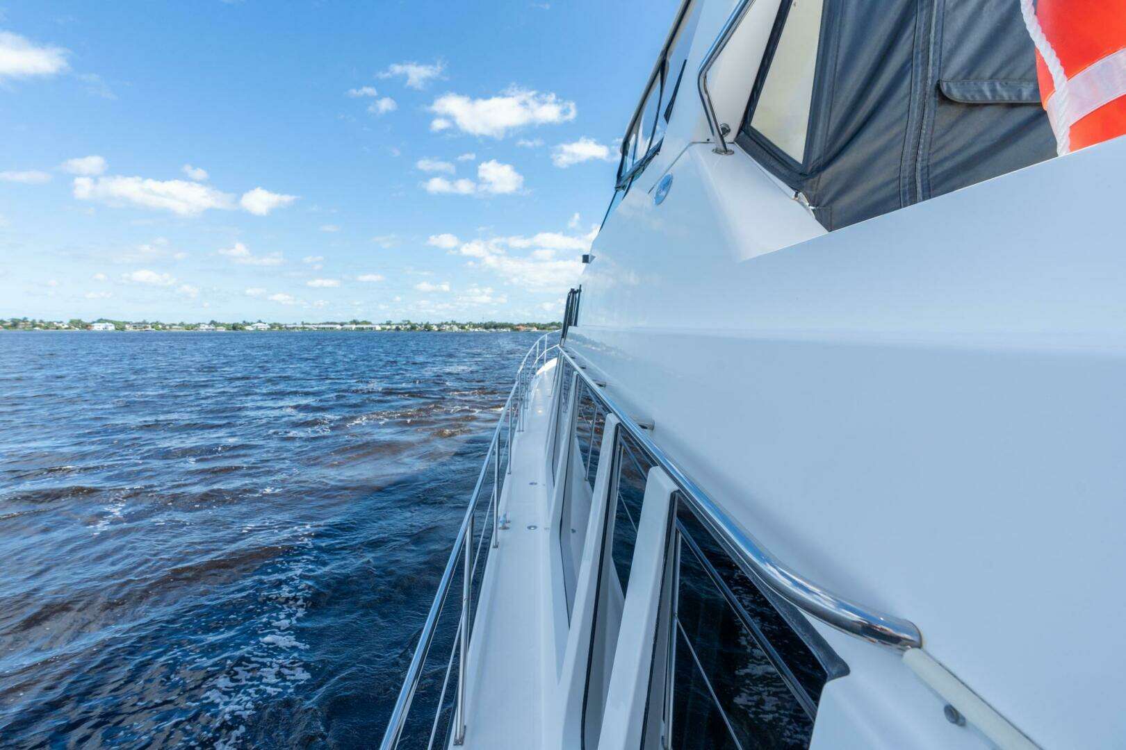 - Large flybridge with hardtop, bar area, grill, and tender storage aft