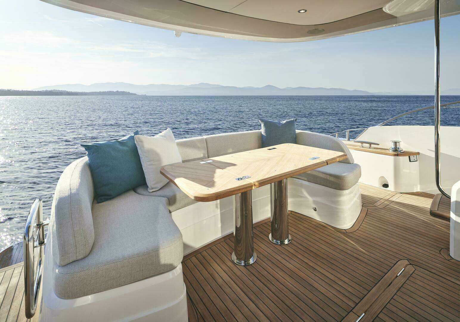 Her contemporary flybridge is the perfect outdoor entertaining area, with ergonomic dining seating, wetbar with barbecue, coolbox and sink, plus an aft sunbed and L-shaped companion seat with infill as a secondary sunbed.