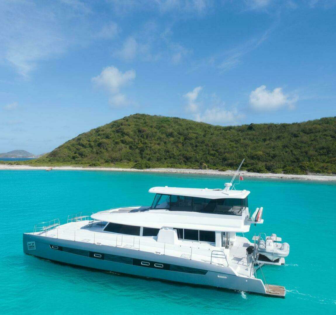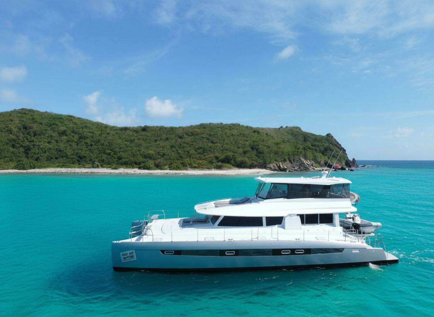 The Voyage 650P "Out of Office" is a 2016 luxury power catamaran featuring 6 guest cabins, modern amenities, Yanmar twin diesel engines, and premium navigation systems. Ideal for private cruising or charter, it offers performance, comfort, and sleek design.