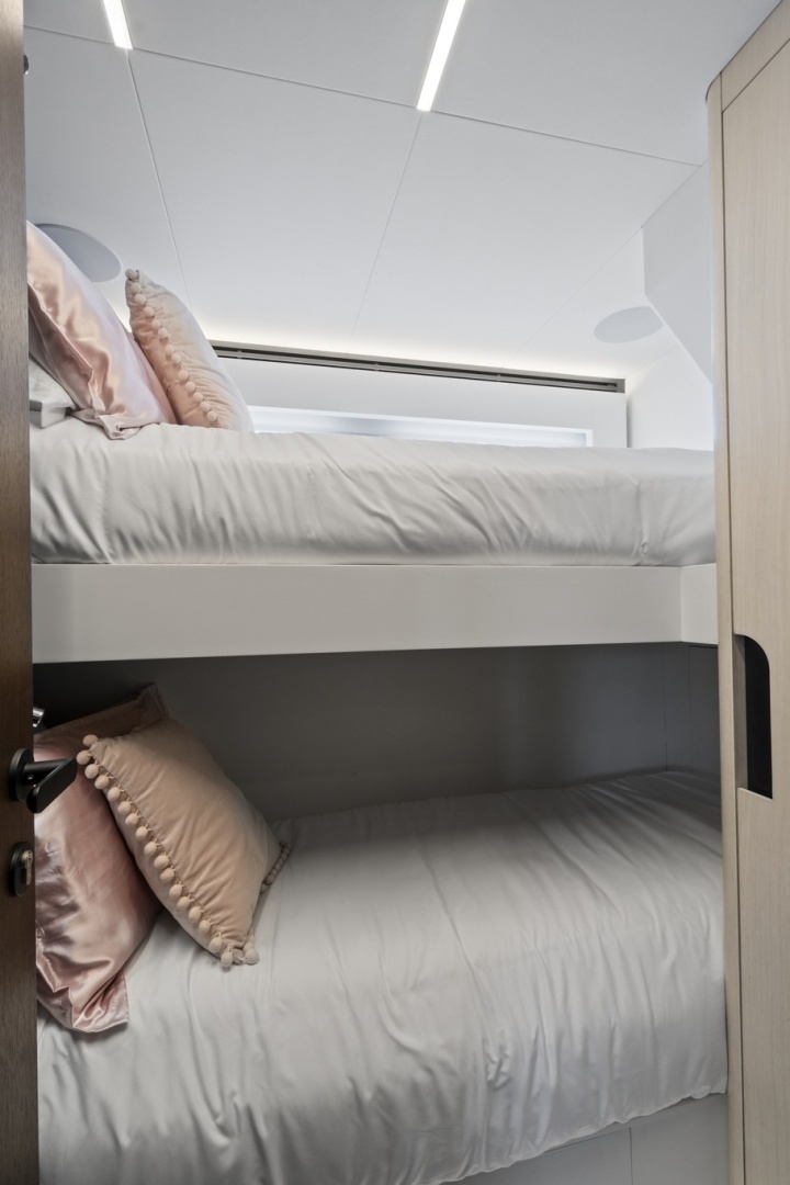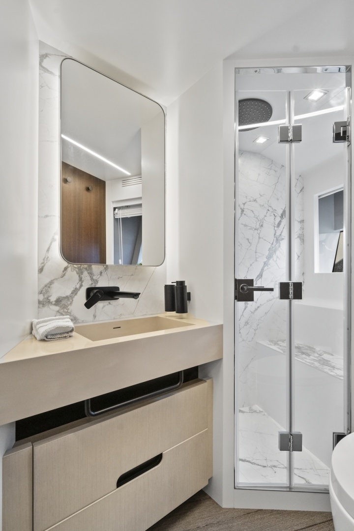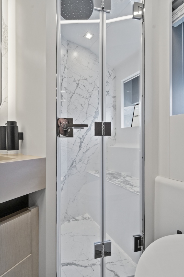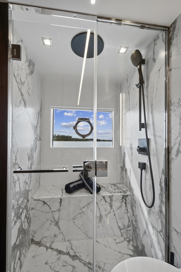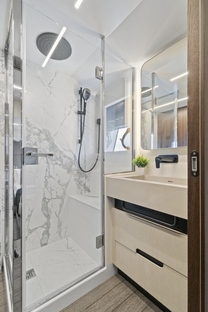 Below deck, the four-stateroom layout delivers both comfort and privacy. Accommodating up to eight guests, each stateroom is thoughtfully appointed with high-end finishes, premium bedding, generous closet space, TVs, reading lights, and private en-suite bathrooms. The main deck showcases an open, airy salon with panoramic windows, a dining area, galley, and aft exterior seating.