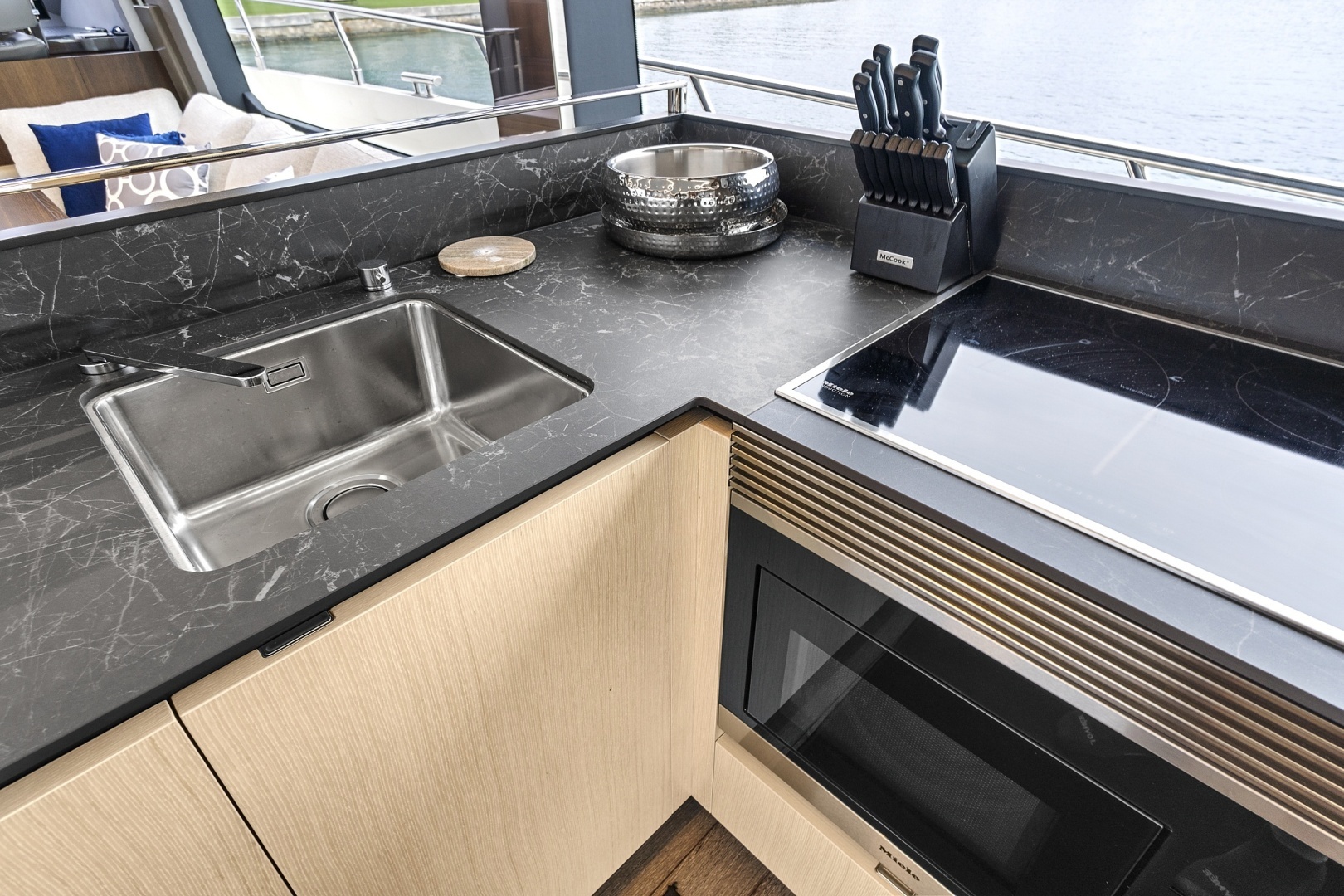 - Flybridge with large seating and dining area, BBQ, refrigerator, ice maker and sink