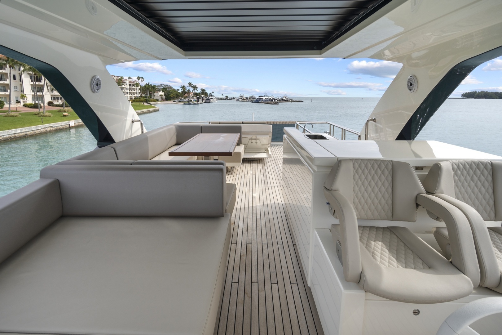 The aft deck welcomes guests with a covered outdoor living area featuring a spacious seating arrangement and table. Expansive glass doors enhance the connection to the interior, creating a smooth, open flow between indoor and outdoor spaces. Up front, the bow deck offers a private retreat with panoramic views, complete with a table, sun canopy, plush sun pads, and beautifully upholstered seating in durable, weather-resistant fabrics.
