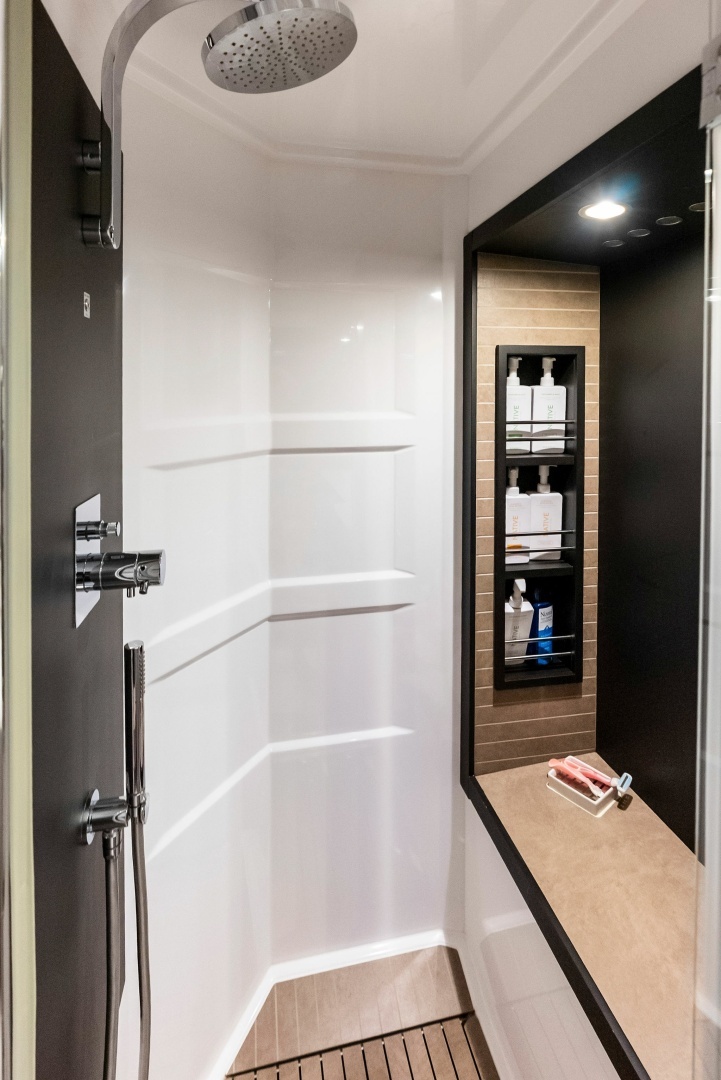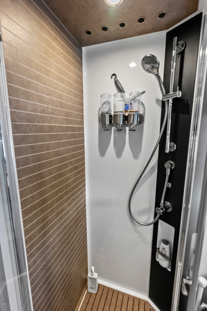 Below deck, the four-stateroom layout is one of the strongest in this category. The full-beam master is located aft with large hullside windows and ensuite head. Forward is a VIP with ensuite, and two additional guest cabins - one with side-by-side twins and one with over/under berths - share a well-appointed day head.
