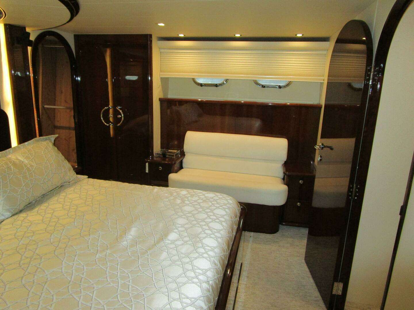 Also in the salon there are upholstered panels above the two position Hunter Douglas Silhouette shades on the cabin side windows and soffit type AC delivery around the perimeter of the salon with LED rope lighting above. Aft are sheer drapes across the nearly full glass aft bulkhead.