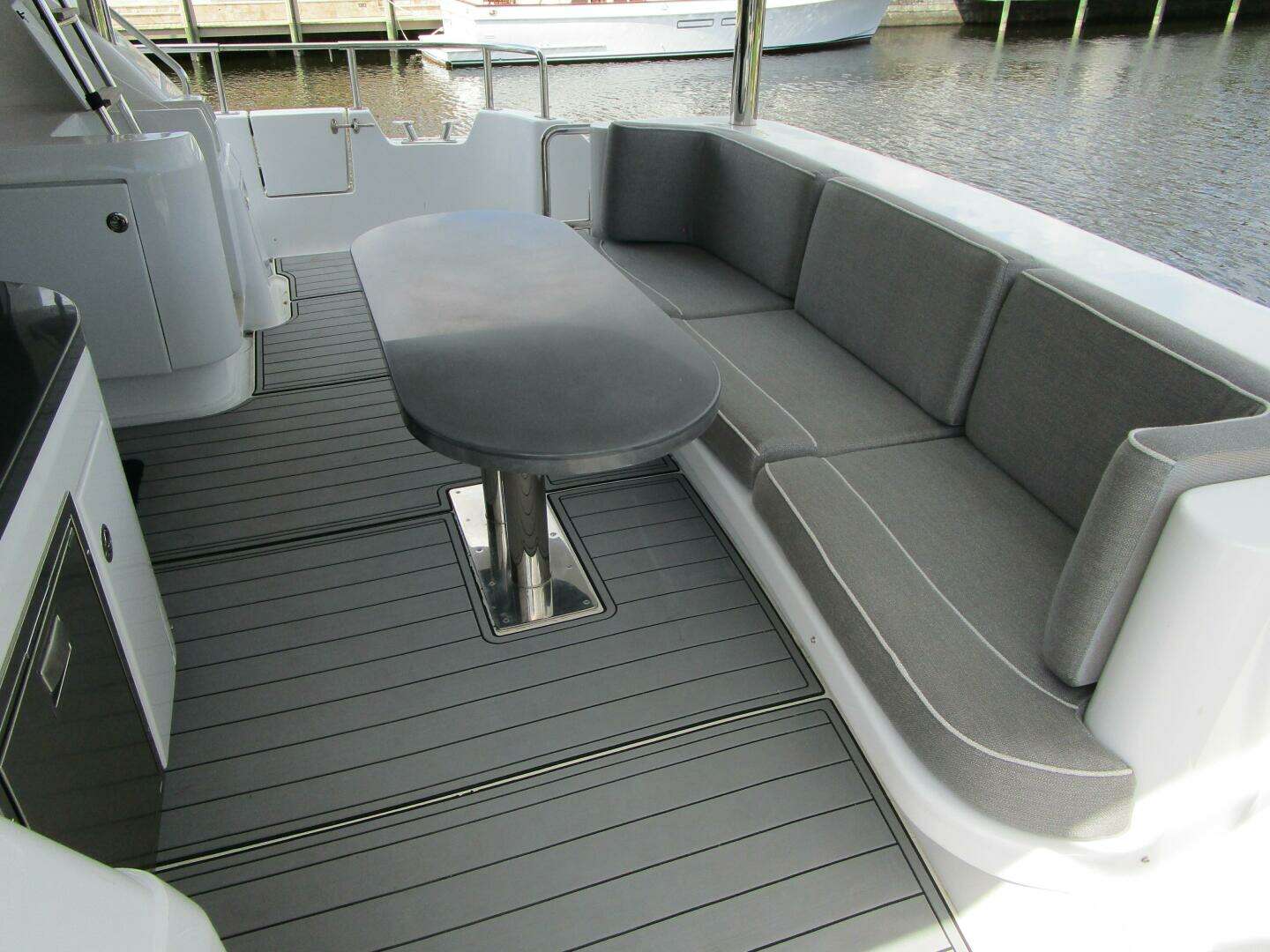 The salon is entered via the centerline stainless steel sliding door and appears very spacious due to the open deck plan and lack of a galley bulkhead.