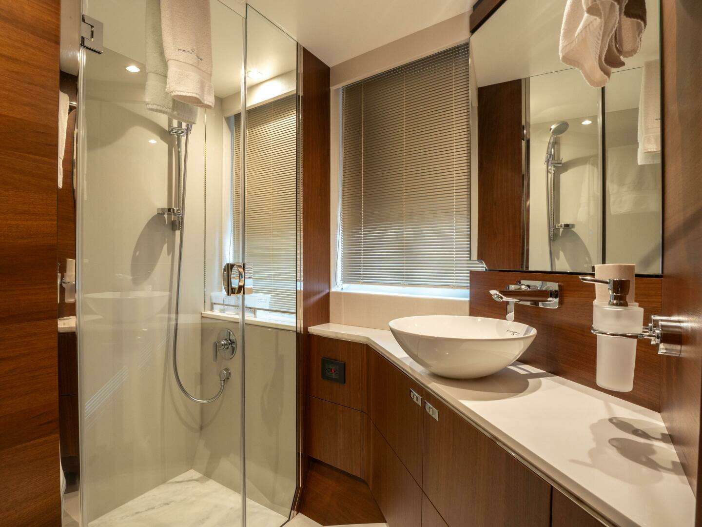- Ensuite bathroom featuring a full shower stall, electric freshwater toilet, extractor fan, mirrored vanity, and Day head access