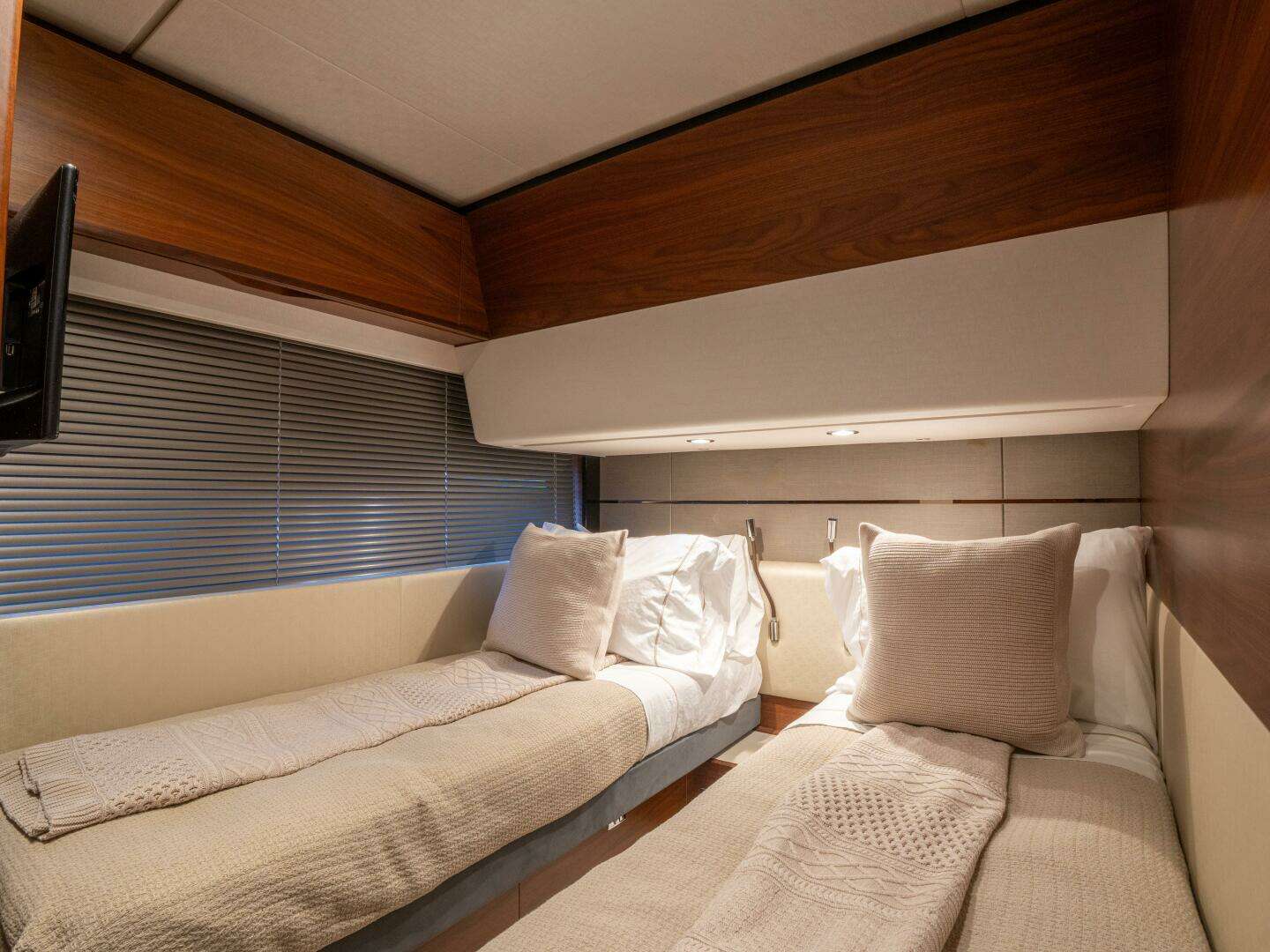 - Twin single berths with powered conversion ability to form a double bed and storage drawers below
