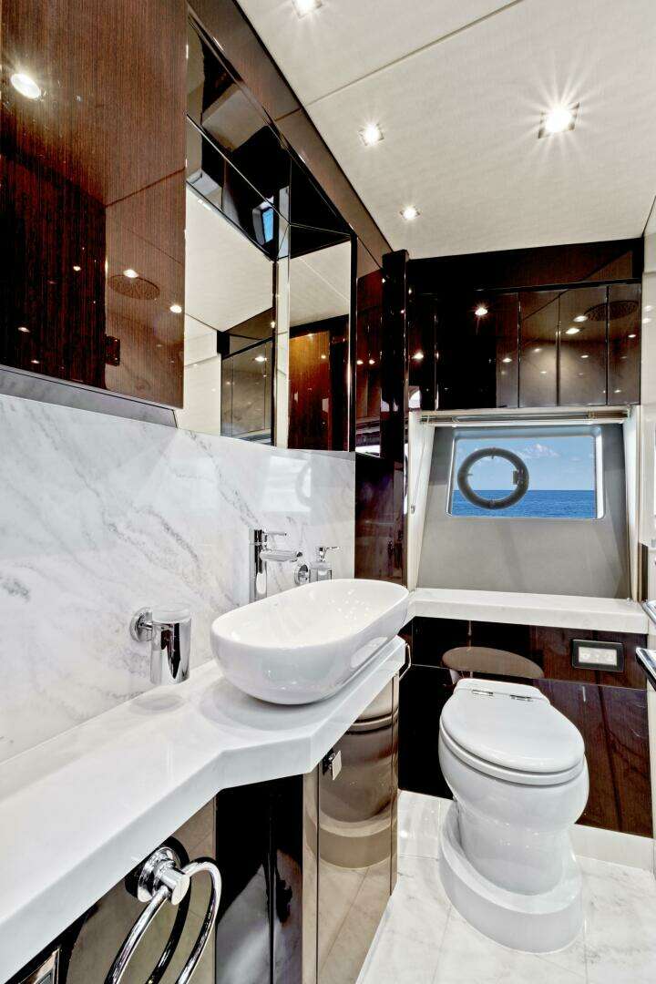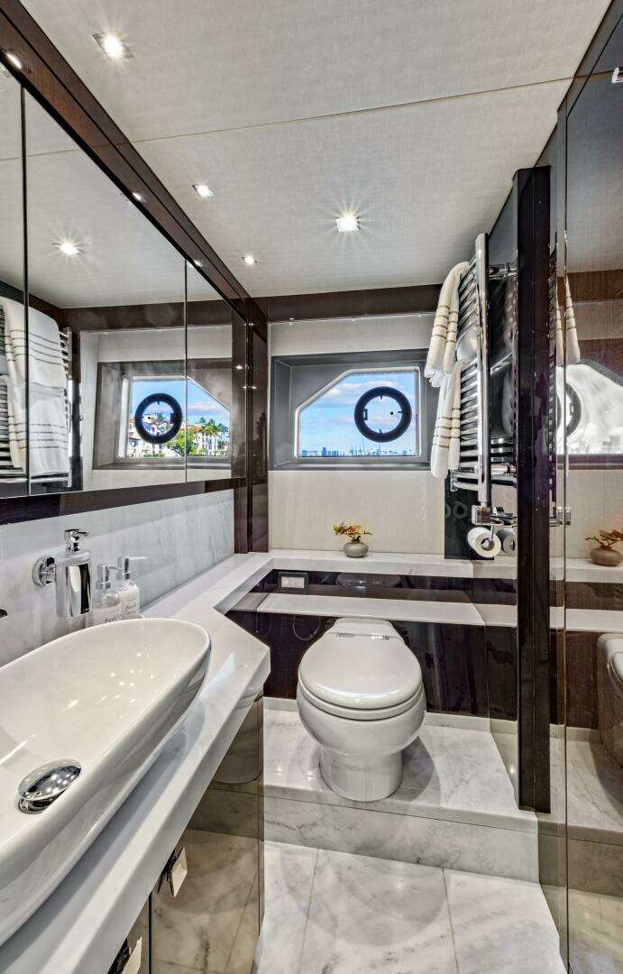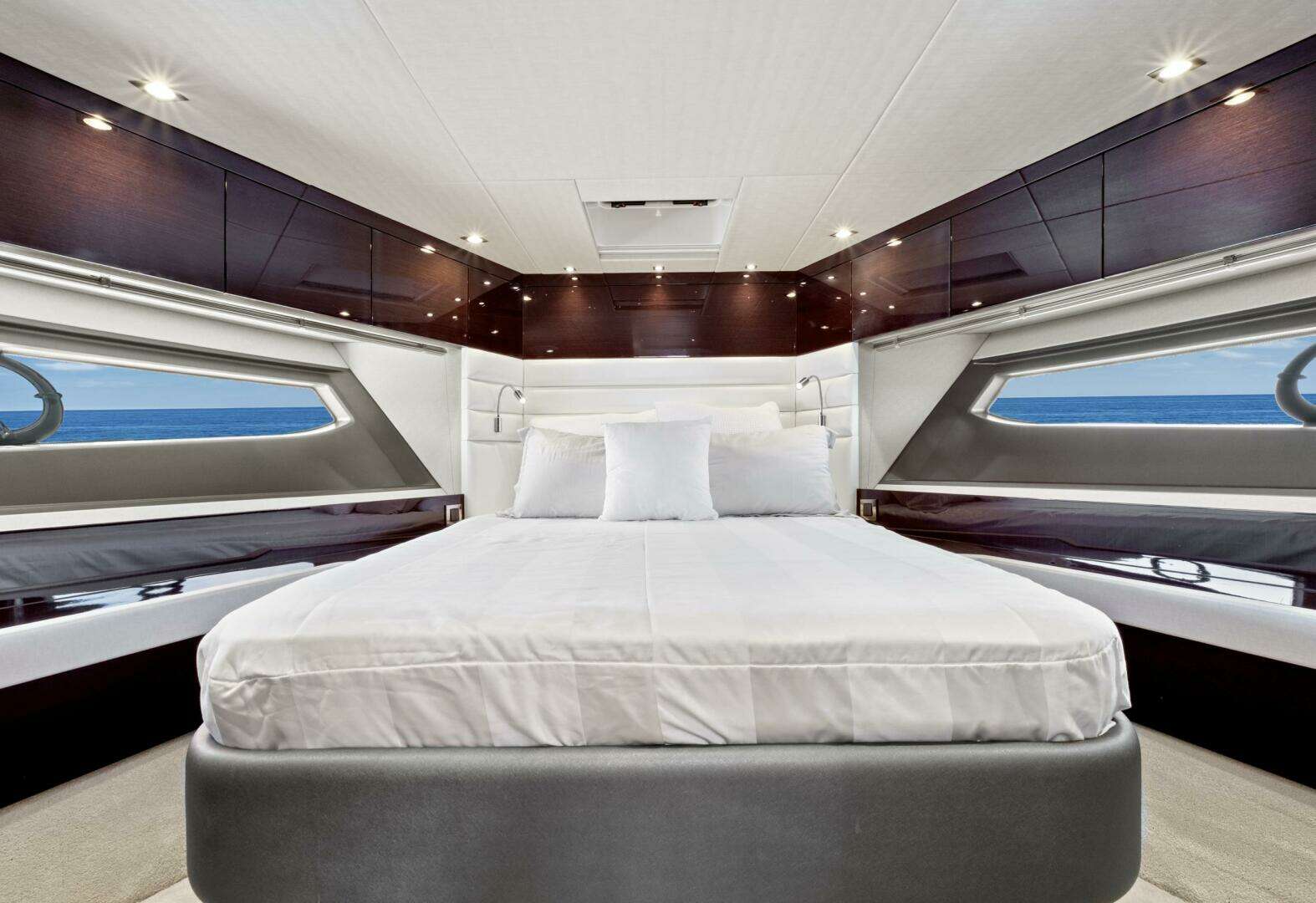 Forward, the VIP stateroom offers a raised bed with refined accents and two large closets—perfect for extended travel—along with a beautifully designed ensuite bath.