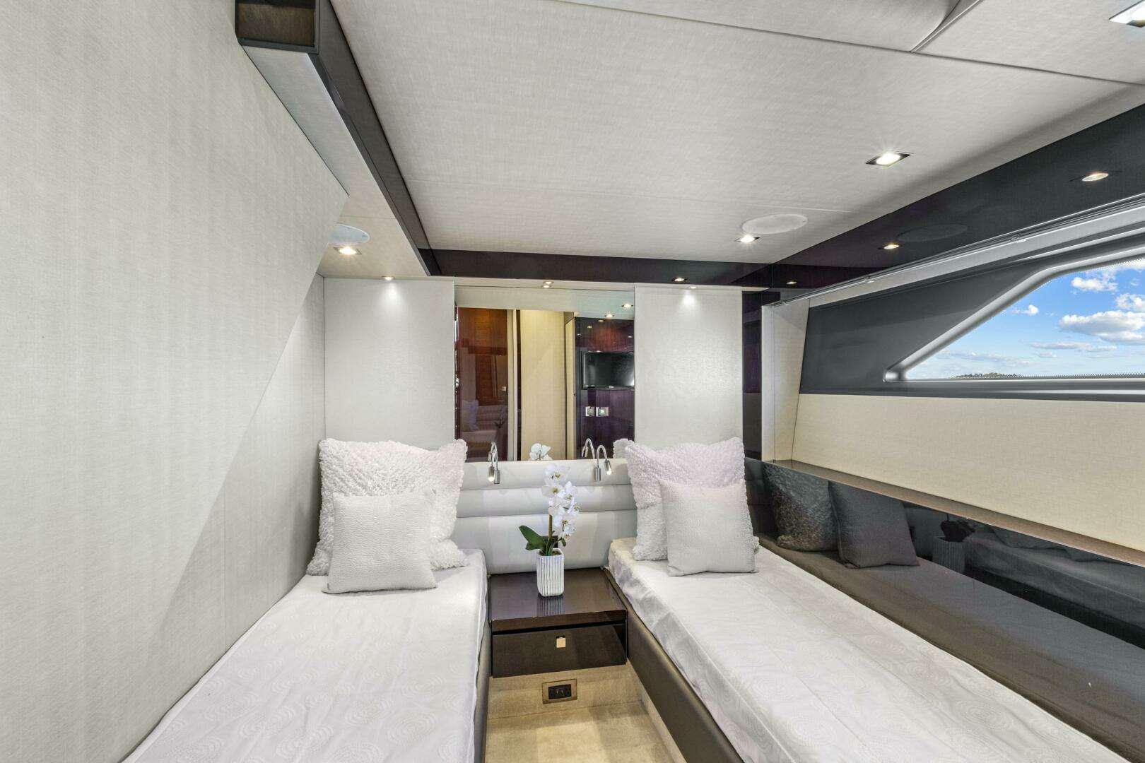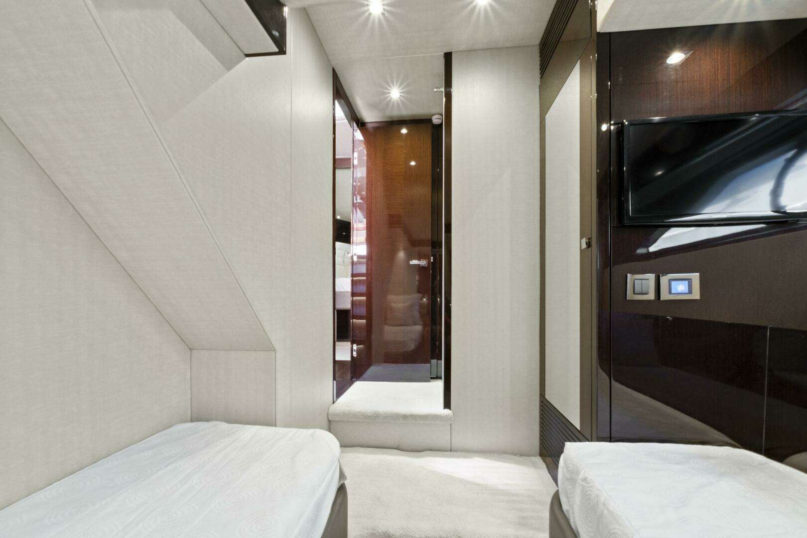 Two additional guest staterooms provide side-by-side berths, personal closets, and televisions, ensuring every guest enjoys a comfortable, welcoming stay.