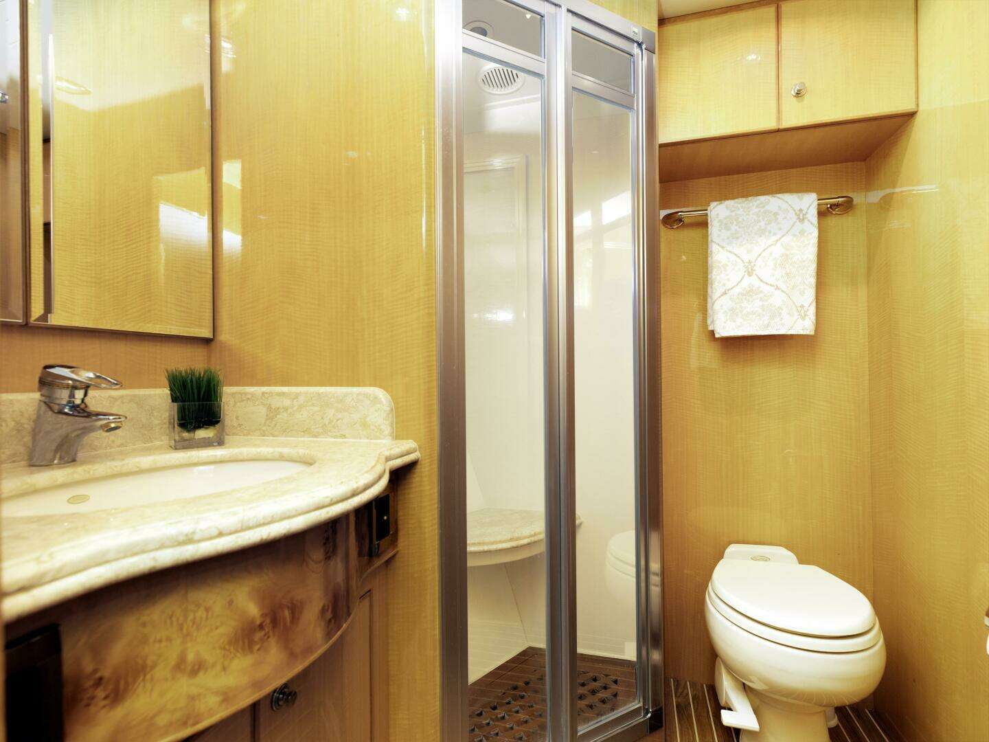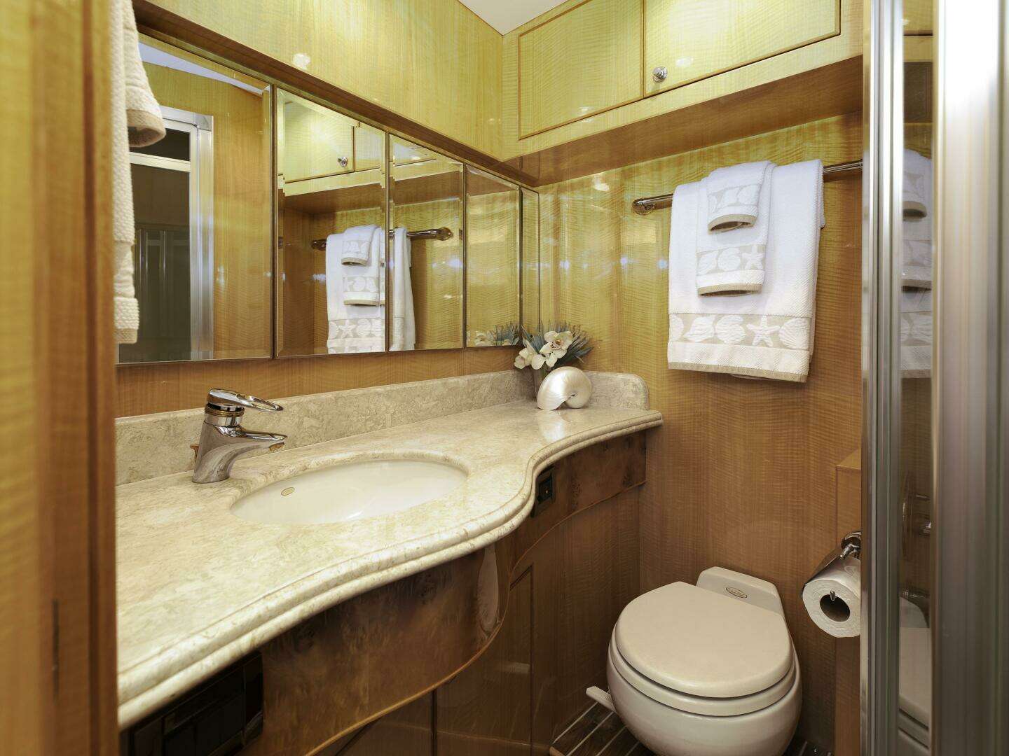 Entertainment is satisfied with an advanced audio/visual package. As you move forward from the salon, the NEW lush carpeting gives way to a warm teak and holly floor that marks the beginning of the galley.