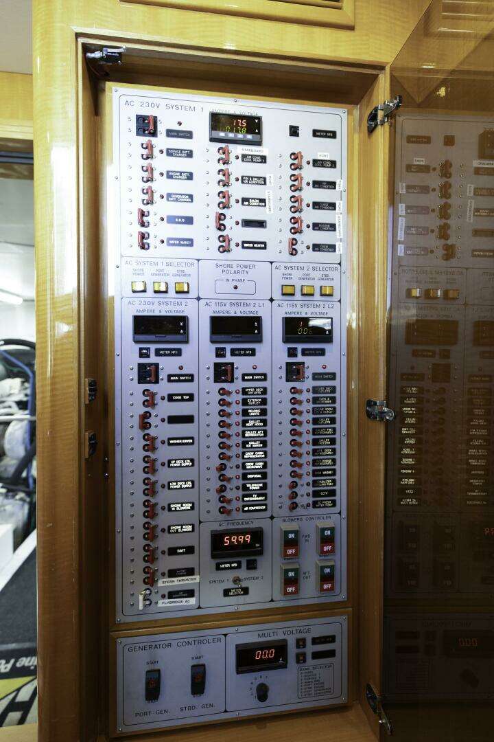 AC 230 volt system 1 w/digital amp & voltmeter & (15) breaker protected circuits AC 230 volt system 2 w/digital amp & voltmeter & (10) breaker protected circuits AC 115 volt system 2 Ll w/digital amp & voltmeter & (12) breaker protected circuits AC 115 volt system 2 L2 w/digital amp & voltmeter & (12) breaker protected circuits Digital frequency meter