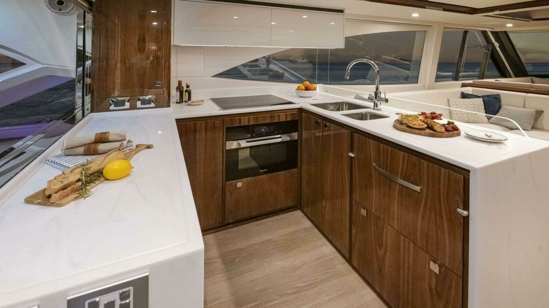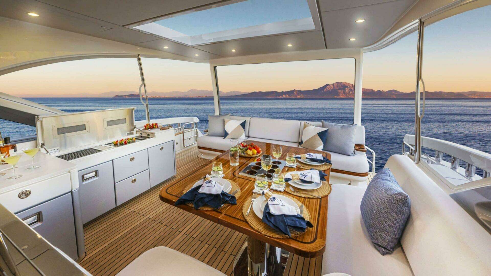 Slide open the saloon door. Then lower the electric galley window with the push of a button. Now the aft deck flows into the saloon creating one grand living and entertaining space with two designer dining areas.