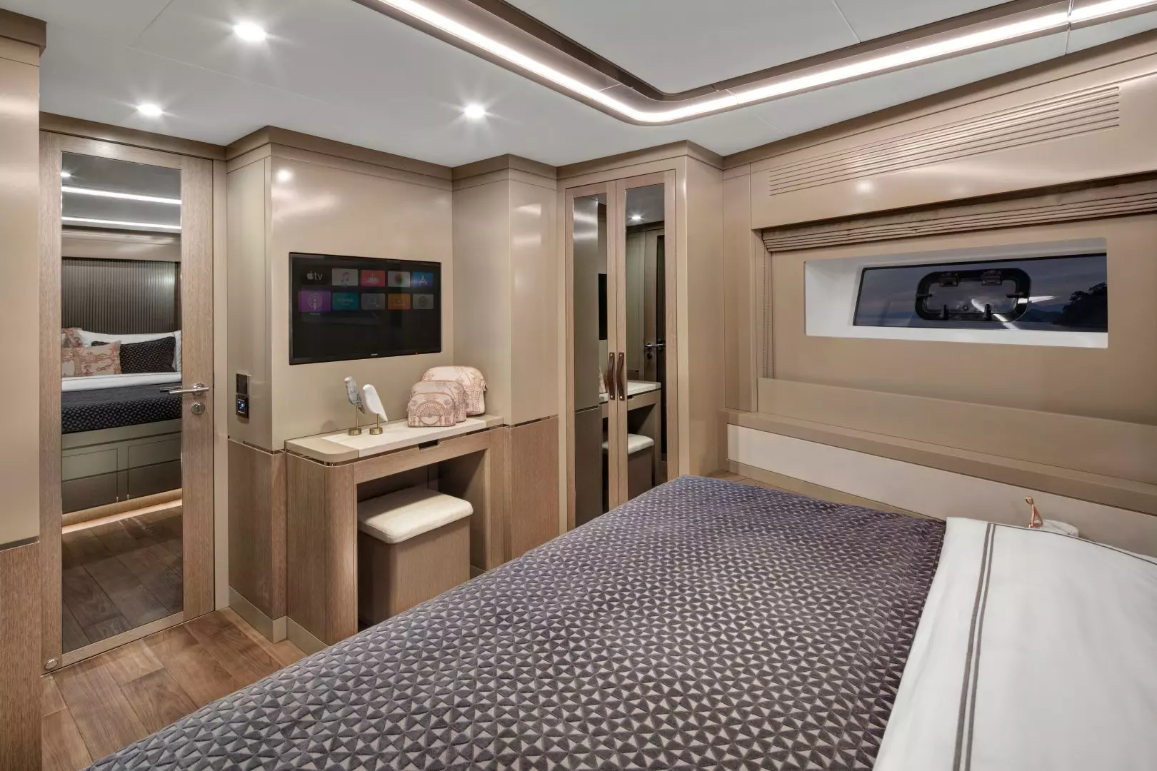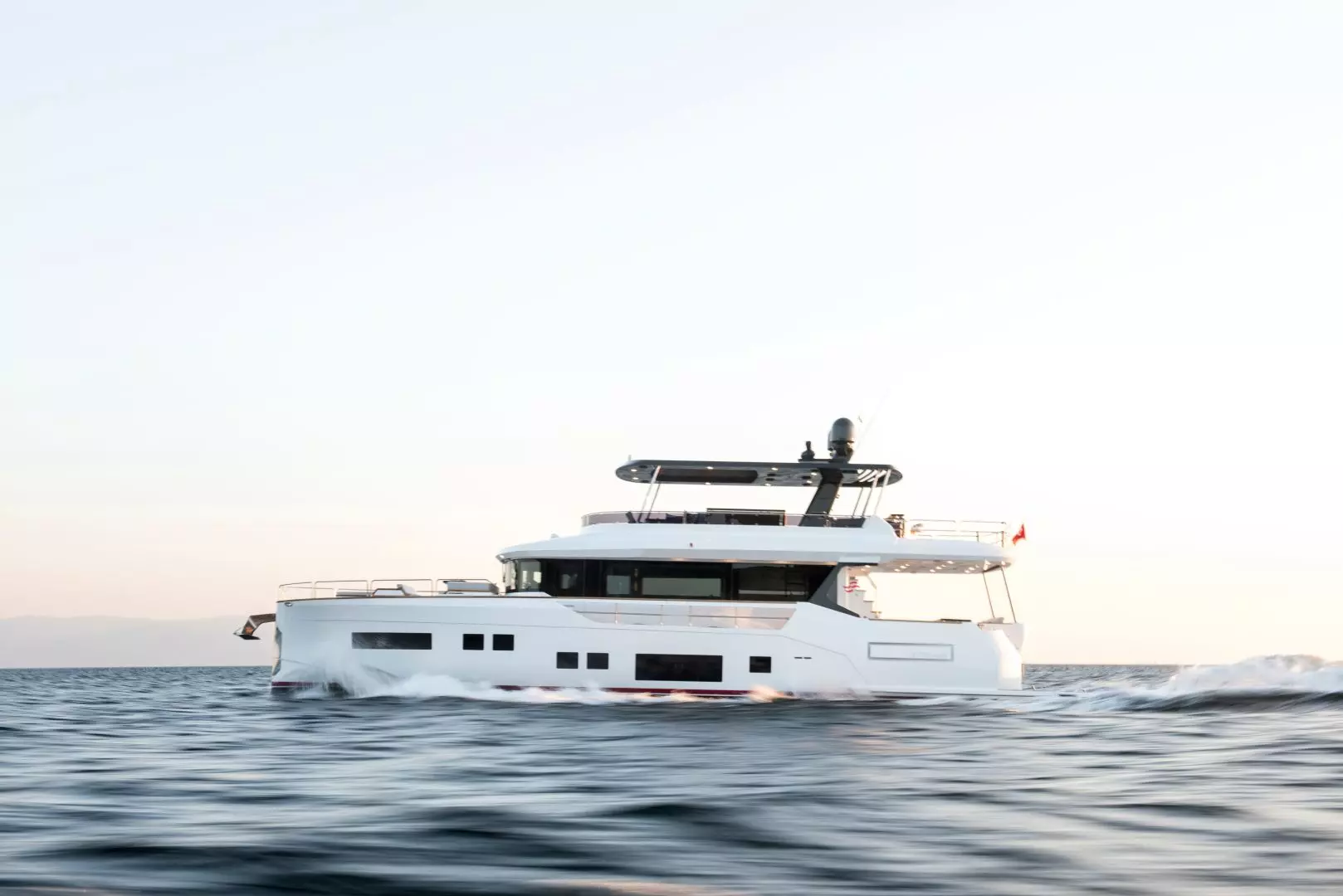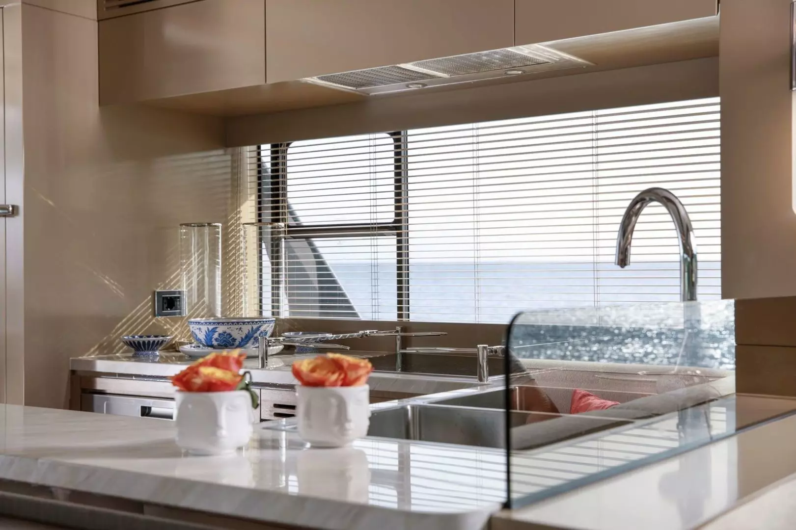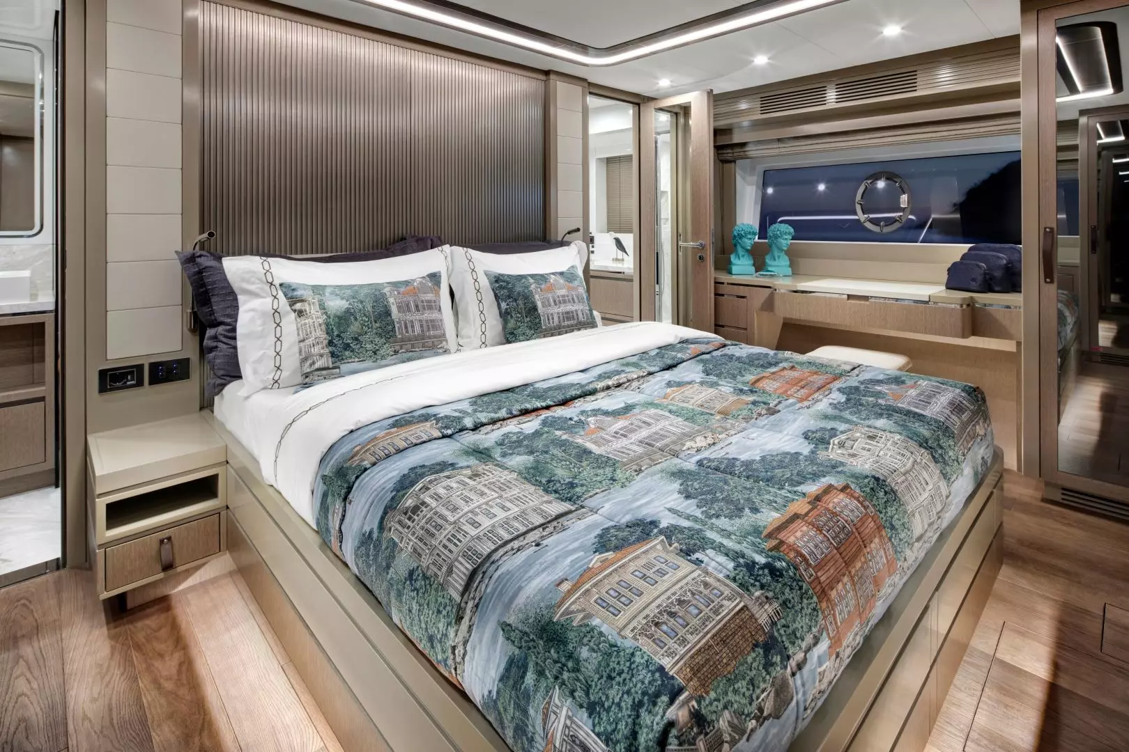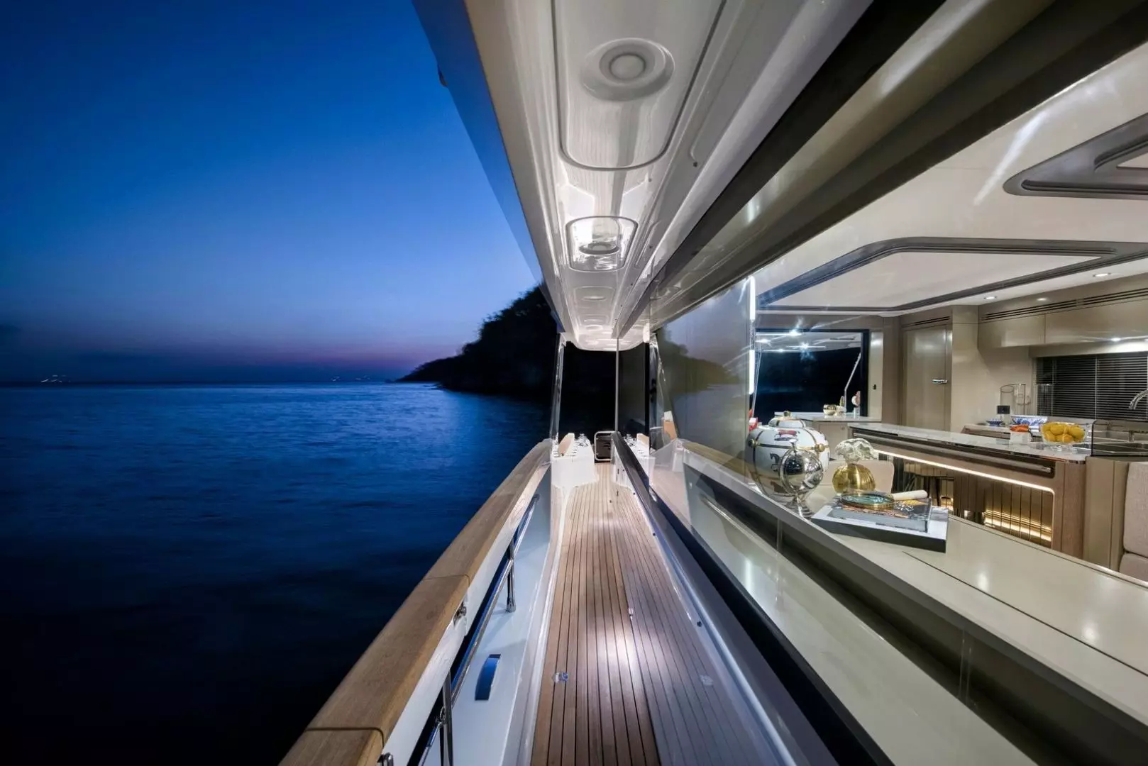 The shape of the hull also creates interior volume that changes the onboard experience for the owners and their guests. Anyone who sets foot on this yacht will find space to allow gatherings of large groups together, as on the flying bridge, the aft deck area, or the saloon, or even the foredeck, where the light and shadow, breezes and views combine to elevate the experience offer a real change of perspective.