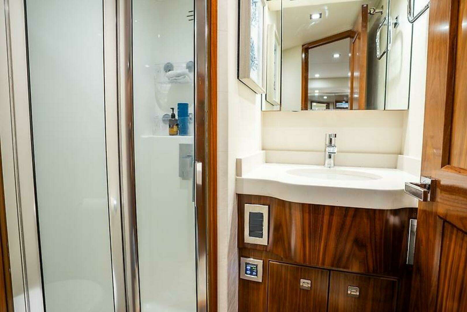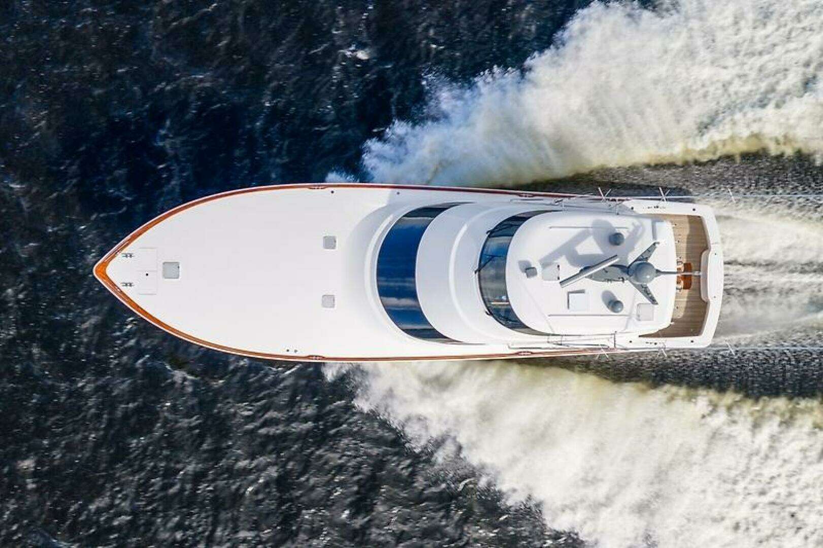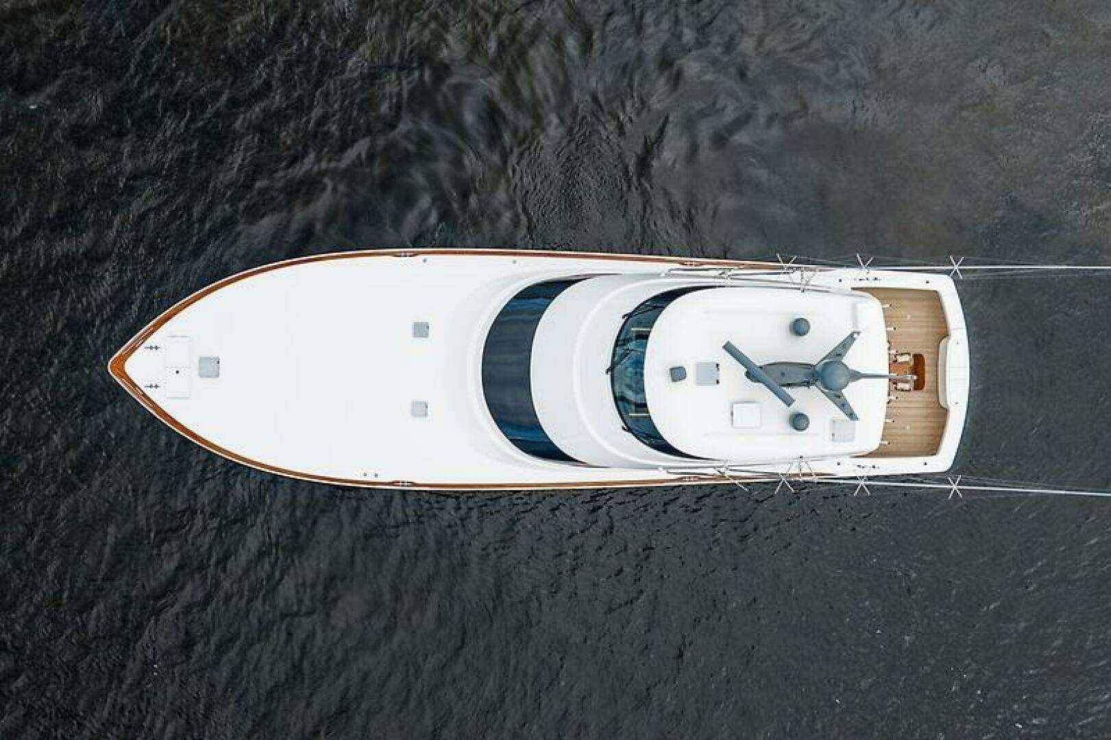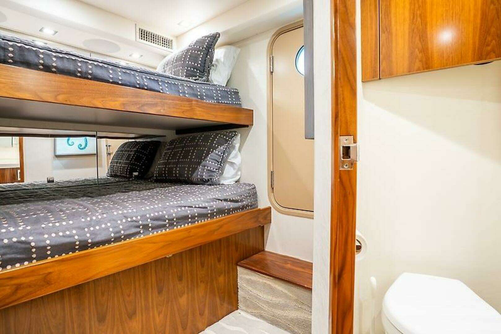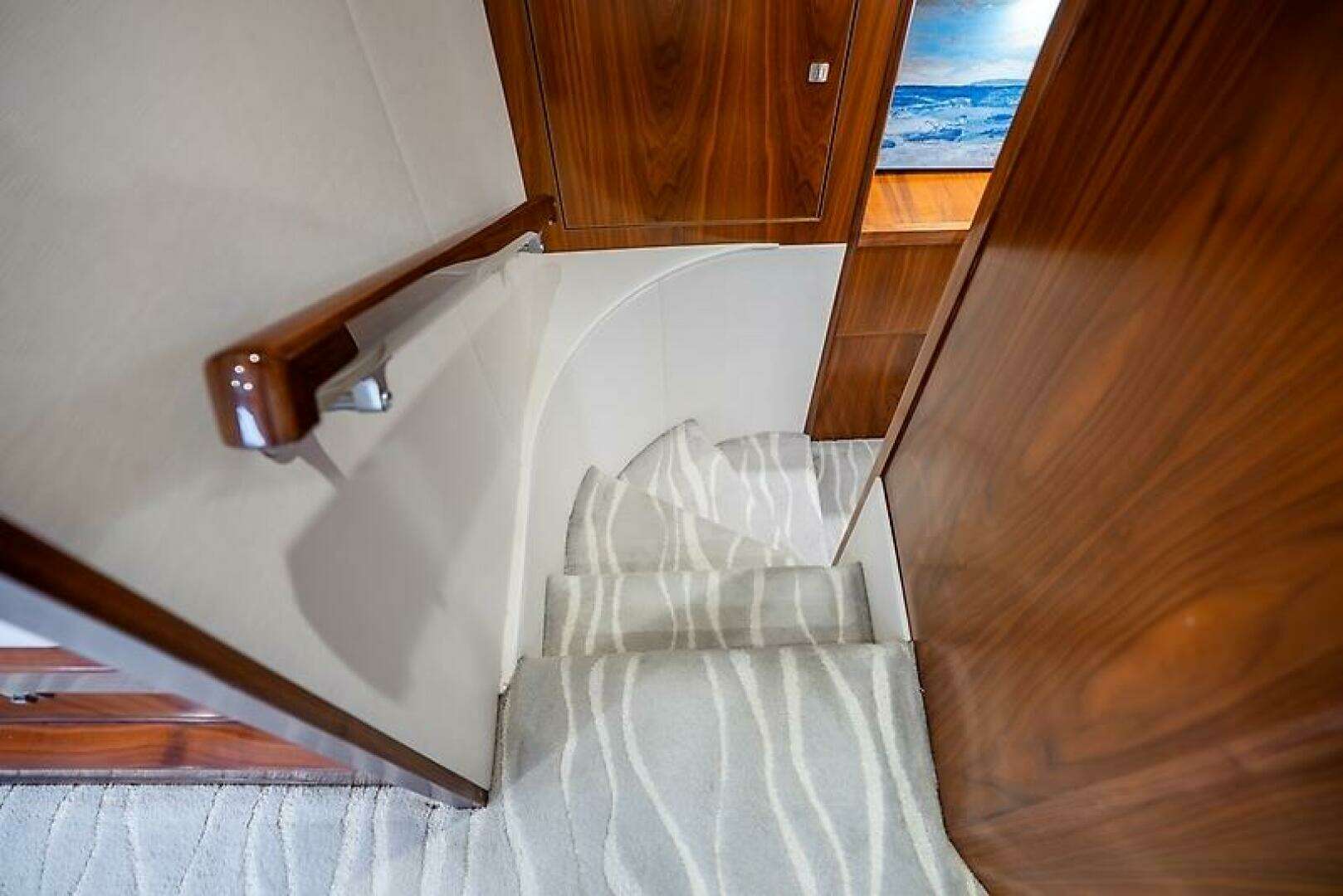 The Viking 68 Enclosed Bridge includes a spacious salon, dinette, galley are with a day head. Below are 4 staterooms including the crew quarters with access to the engine room. The large flybridge doubles as a second salon with an l-shaped couch, cocktail table, and 3 Stidd helm chairs. The raised island navigation center puts all the electronics at easy reach. The aft deck of the bridge has a helm station for docking or fishing as well as an aft facing riding seat. The bridge can be accessed from the cockpit via a flybridge ladder or from the salon interior stairway.