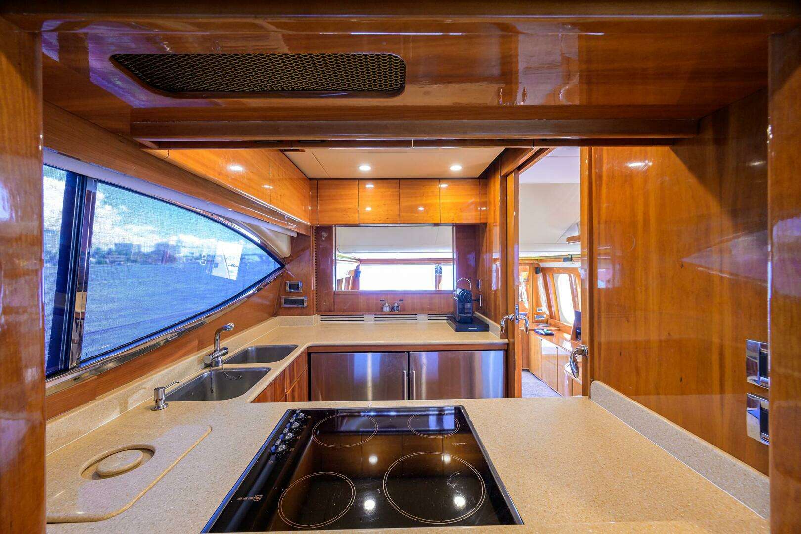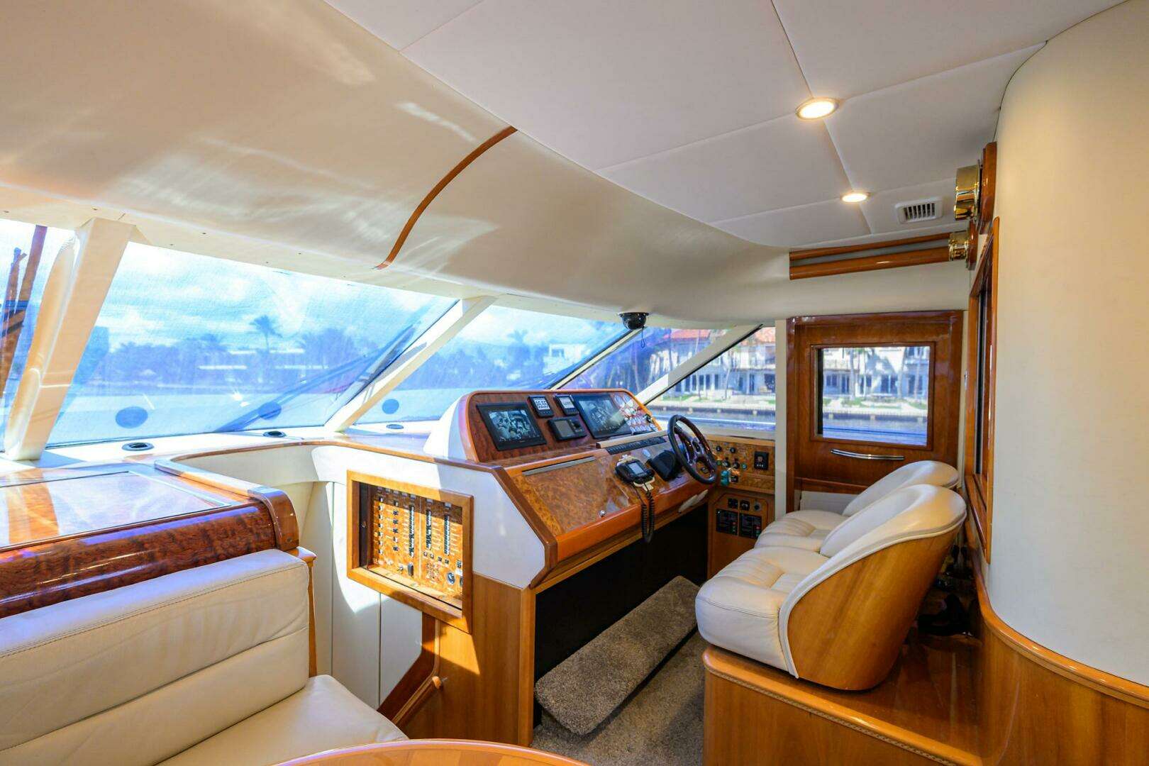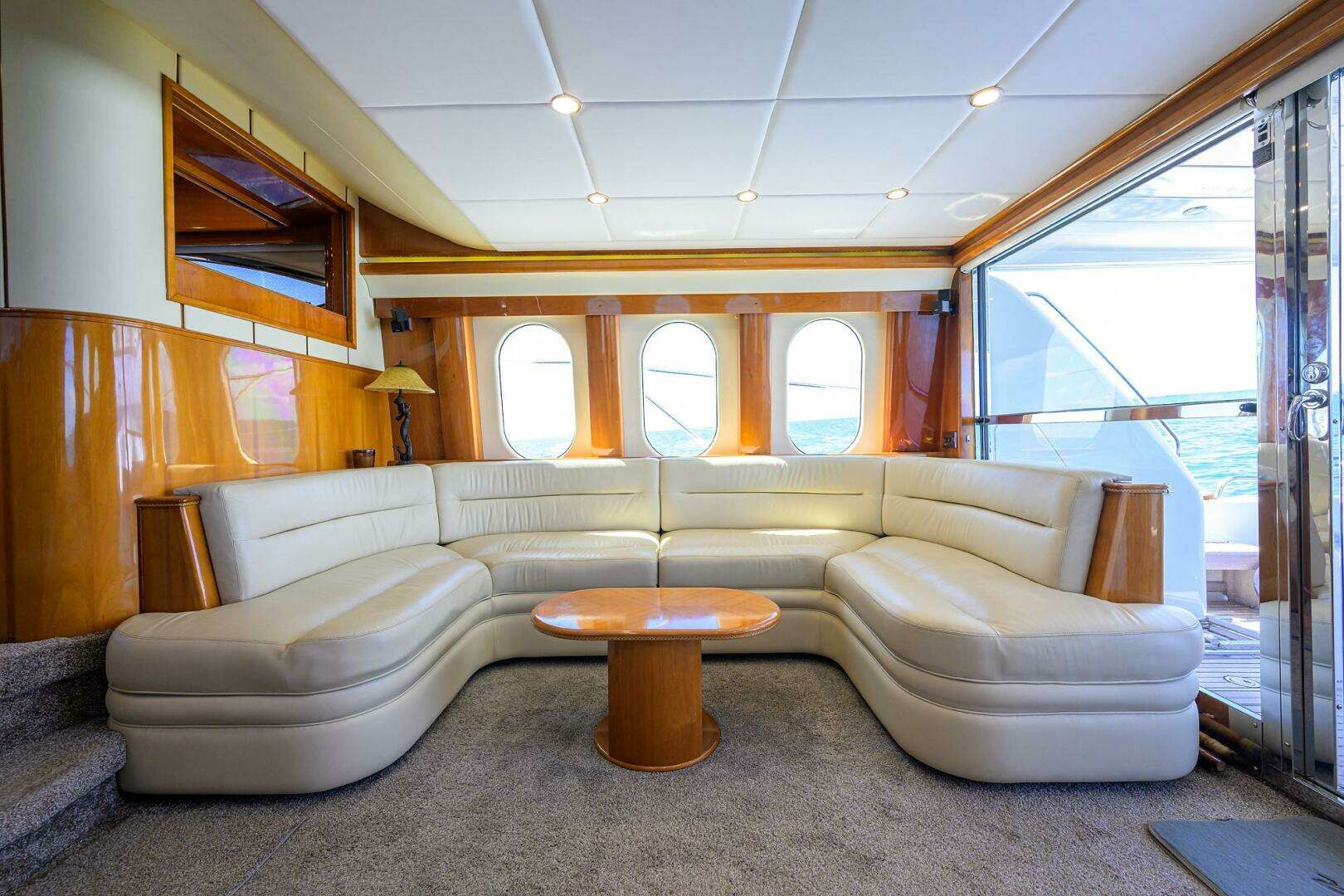 Forward is the command bridge which is fitted with a full-console helm station forward to starboard followed by a watertight door outboard and a bulkhead with an electrically raised and lowered partition, the U-shaped galley, and a bulkhead fitted with a second electrically raised and lowered partition. A raised dinette is opposite the helm to port. Two steps down is the salon which is fitted with an entertainment console to port followed by locker stowage containing a large flat-screen TV which can be raised and lowered electrically. A U-shaped settee is to starboard with stowage under. A sliding glass door and fixed glass partition aft provide access to the cockpit. The cockpit is fitted with locker stowage outboard of the main cabin door to port and starboard, a hatch in the sole forward to starboard accessing the equipment/mechanical spaces, and a larger hatch in the cockpit sole aft on centerline providing additional access to the mechanical spaces. Access to the