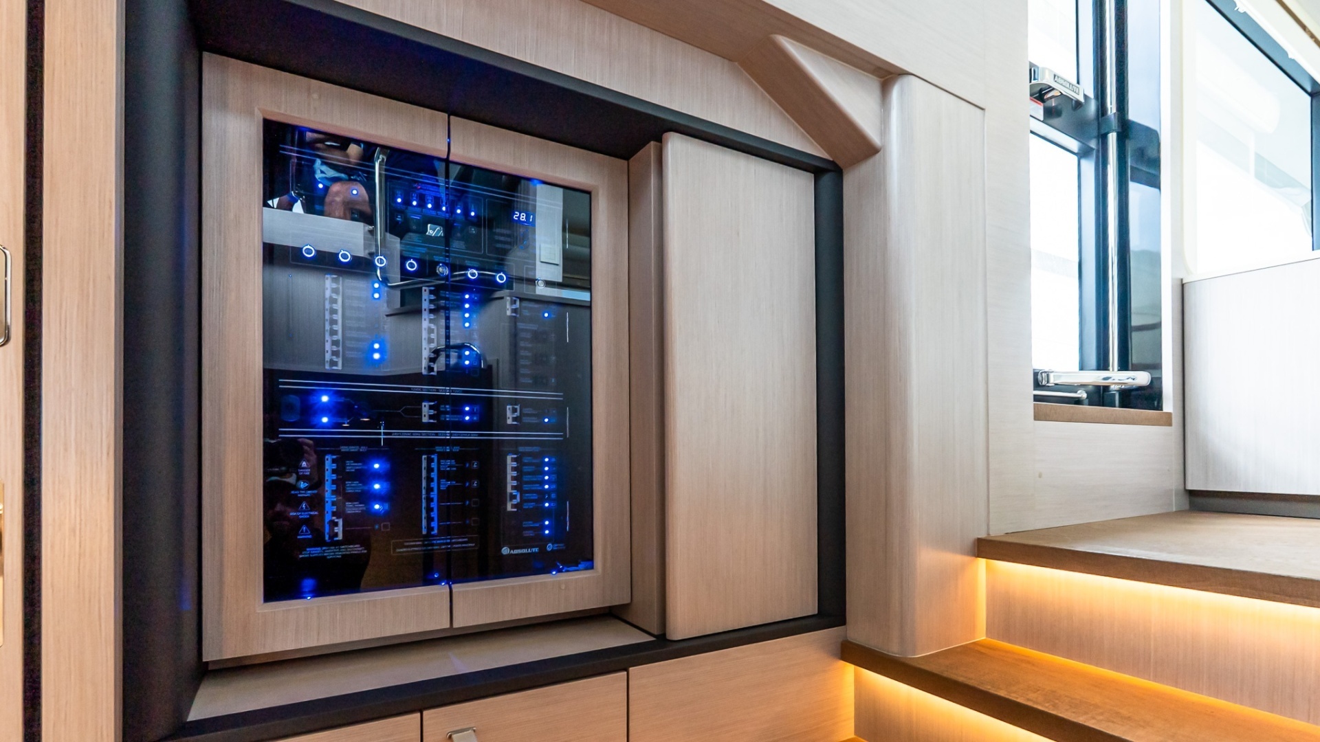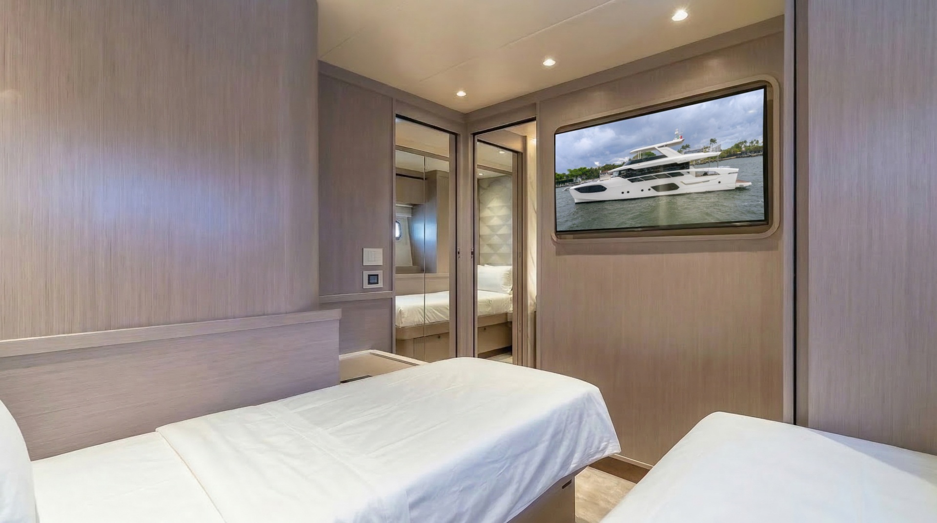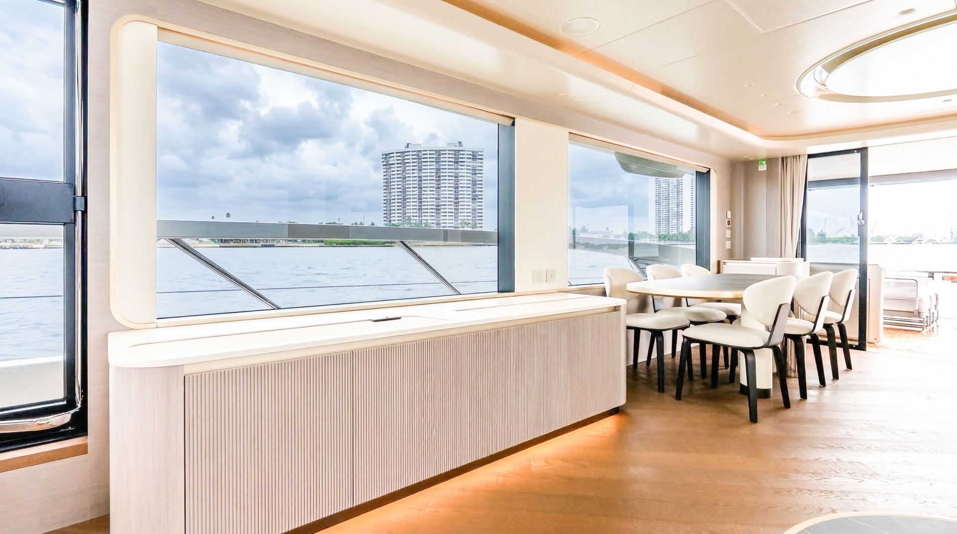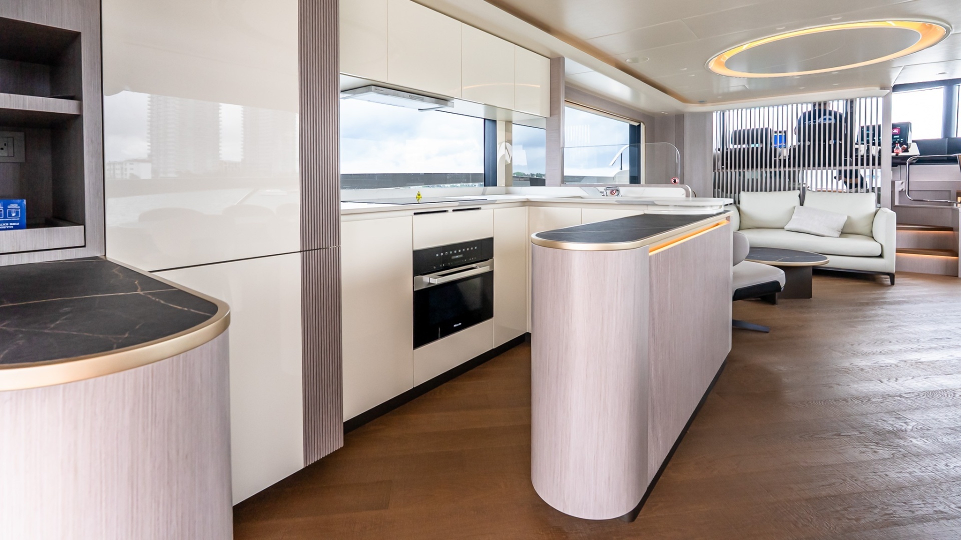 Every detail of the Absolute Navetta 70 expresses the allure of a completely new model, starting from the dynamic and captivating appearance of the exteriors: the flybridge and cockpit terrace are much larger compared to those of other similar yachts. From the spacious terrace cockpit at the stern, where there is a third mooring station, a covered staircase leads up to the flybridge. Here one can enjoy moments of relaxation and socializing, taking advantage of the shade offered by the hard top, which can assume two distinct configurations depending on the customization chosen. It can, in fact, be openable if one opts for coverage through a sunshade, or fixed if one prefers the addition of solar panels, which are lightweight, efficient, flexible, and resistant to the effects of salt water. The interior features an open layout with a spacious kitchen. There are five cabins, each have large windows allowing serene views of the sea. High ceilings throughout the boat allow for a sophisticated design of the living spaces.