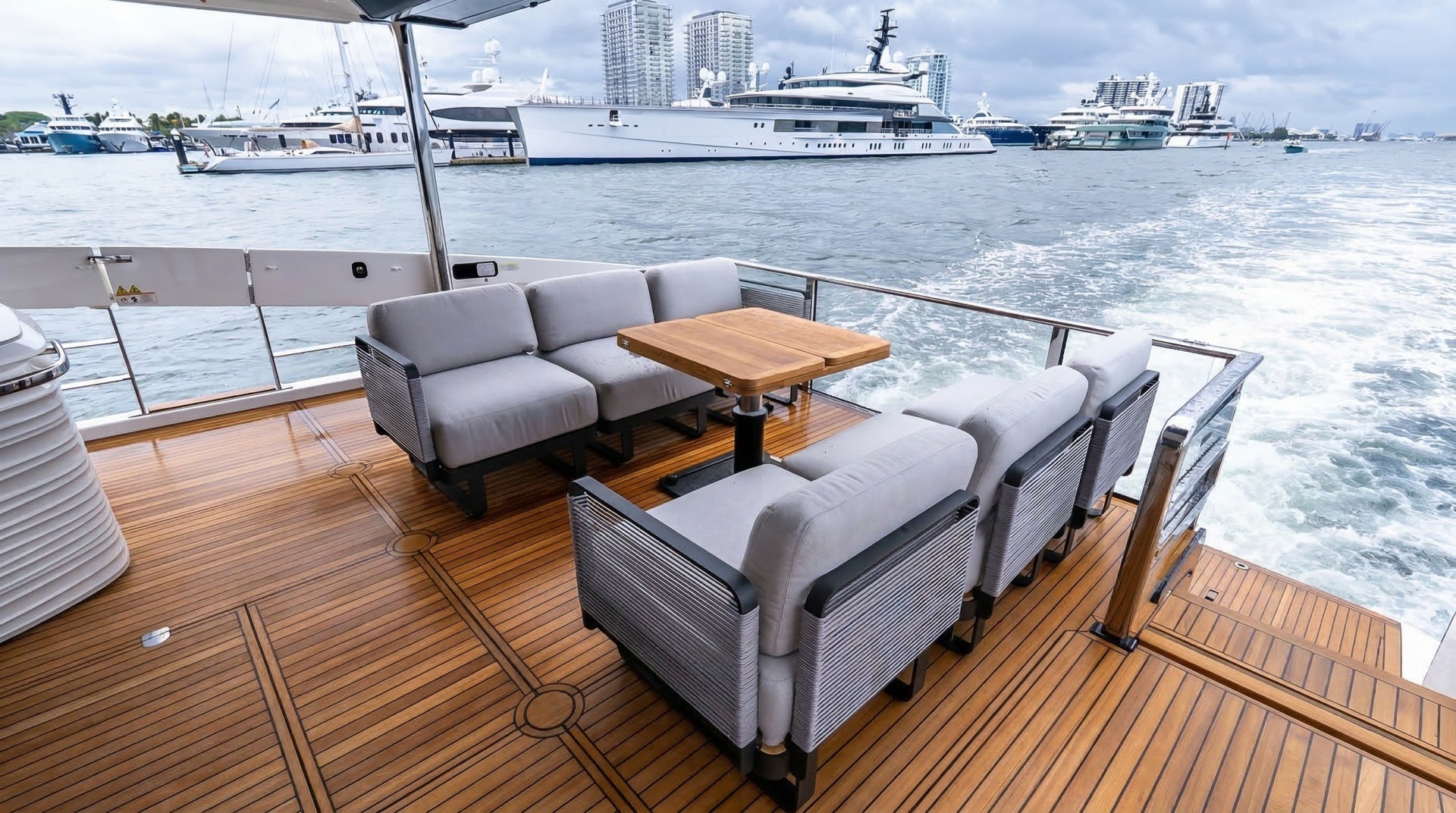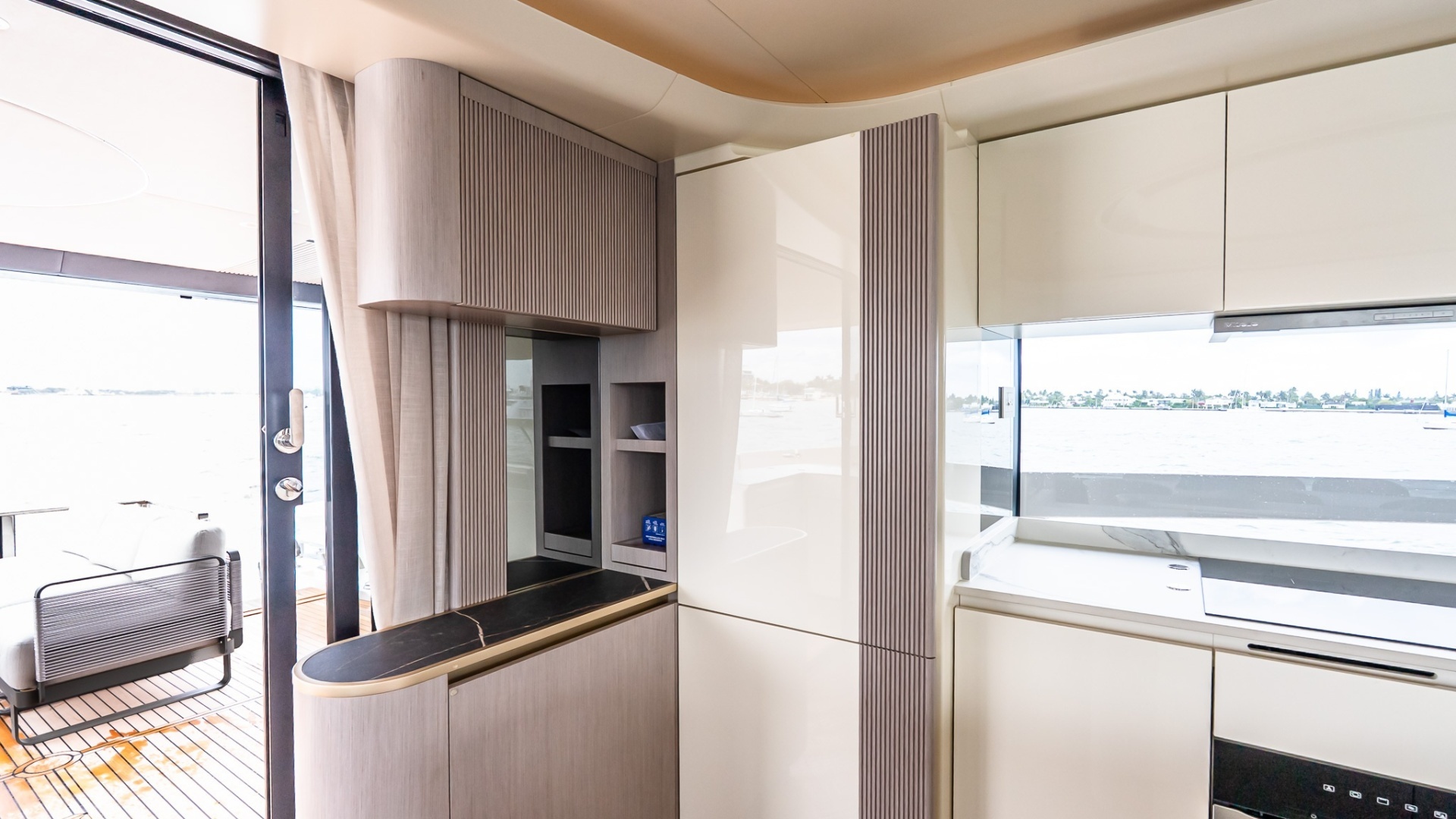 - Fly Galley w/ Corian Countertop, Sink, BBQ, SS Refrigerator, Waste Bin & Storage