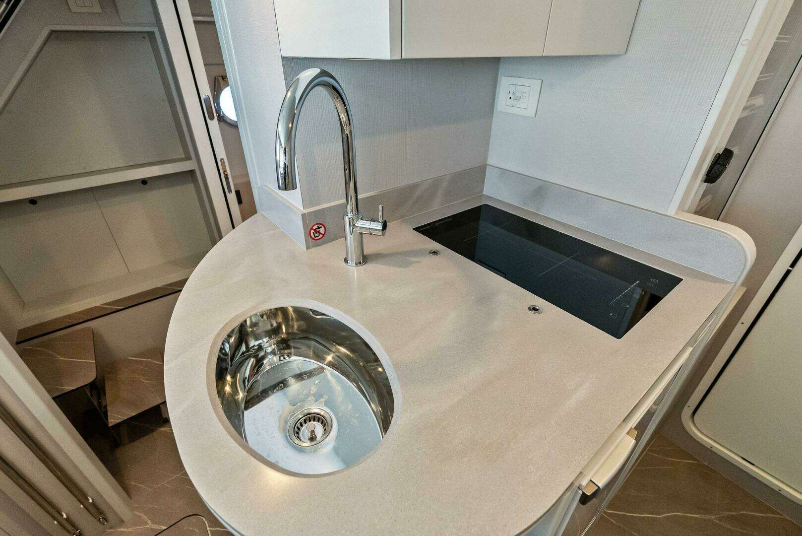 - Galley in Crew Cabin Equipped with Sink, Two Burner induction, and wall cabinet, Corian countertop with table