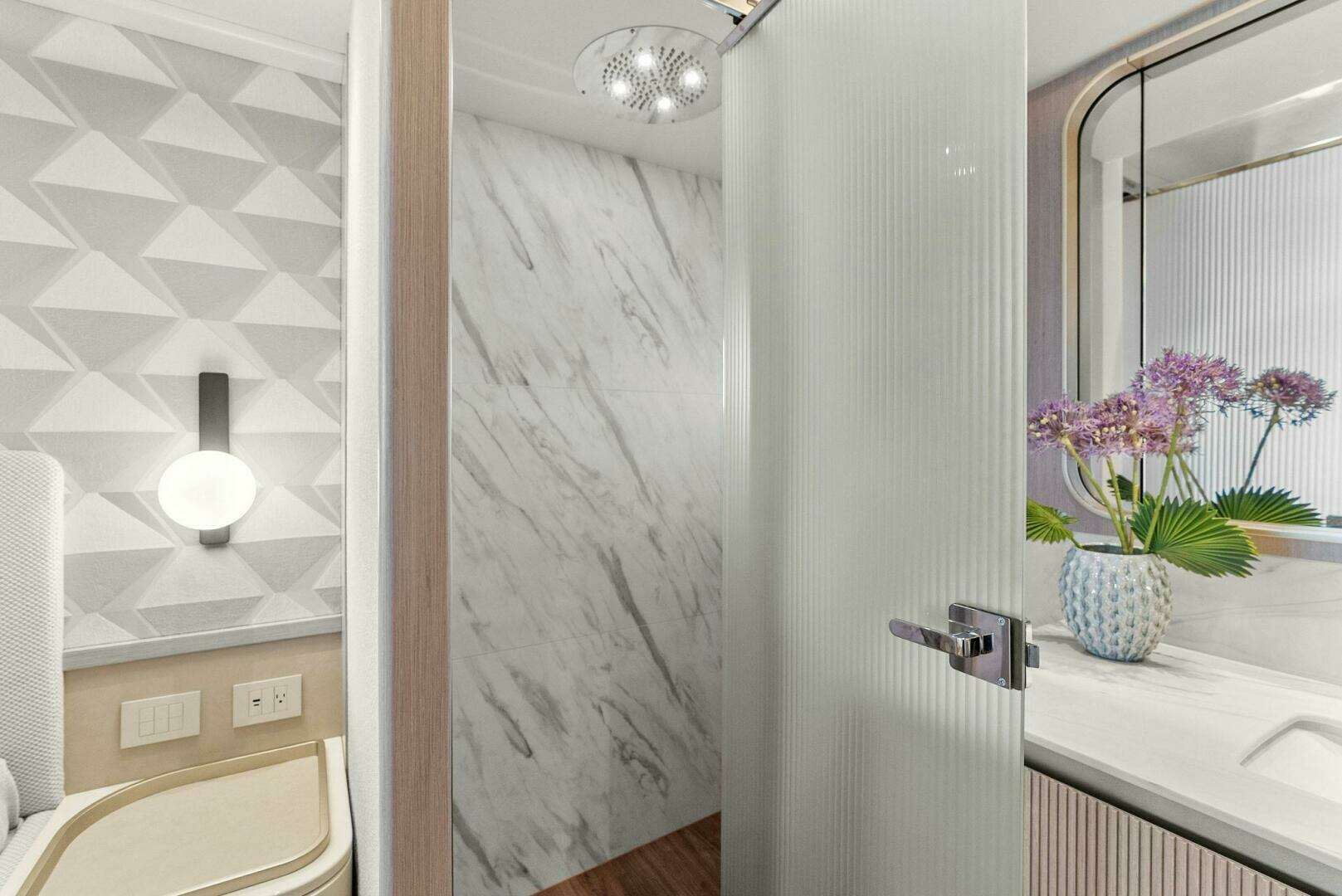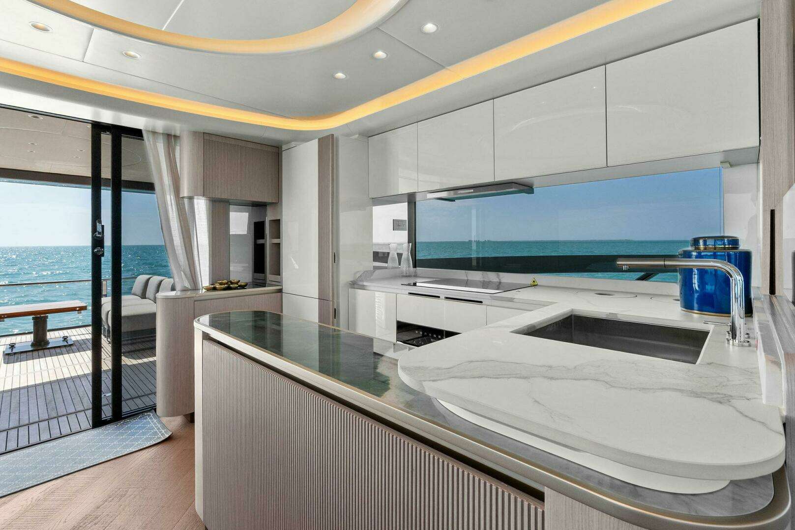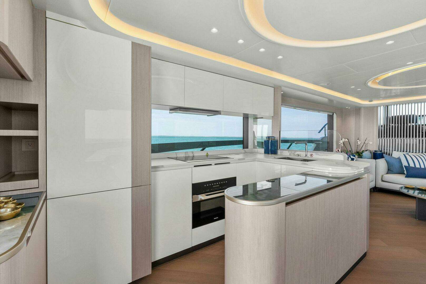 Imagine soaking in 360-degree ocean views from the spacious flybridge or enjoying a sunset dinner on the oversized aft deck. Inside, the contemporary, light-filled interiors create an atmosphere of effortless elegance. Thoughtfully designed open spaces, high ceilings, and panoramic windows make the yacht feel even larger, blending comfort and style seamlessly.