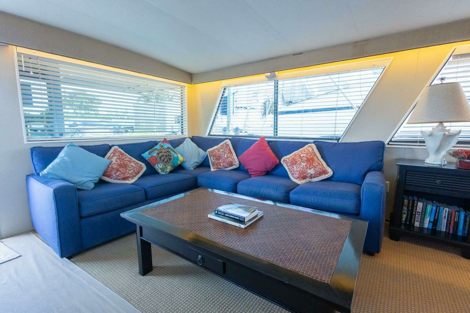 - Full U-shaped bridge seating with storage underneath, cushions (2023), and covers