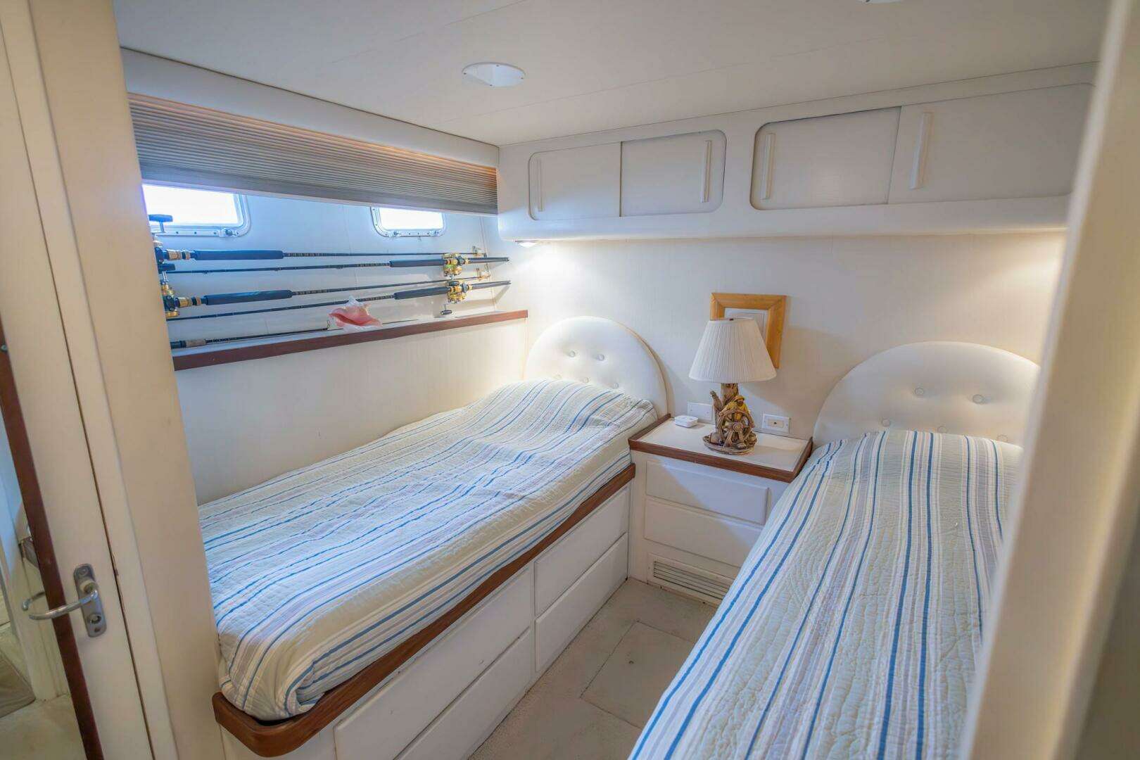 The Midship Guest Stateroom features twin berths with nitestand between and an abundance of drawer and hanging locker space.