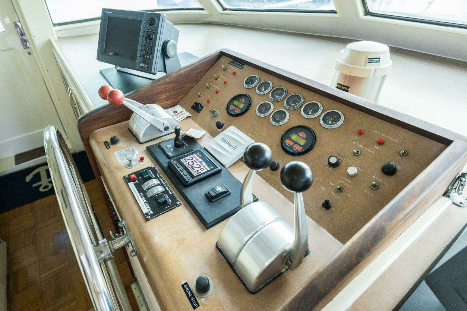 - Complete mechanical engine gauges with tachometers in engine rooms