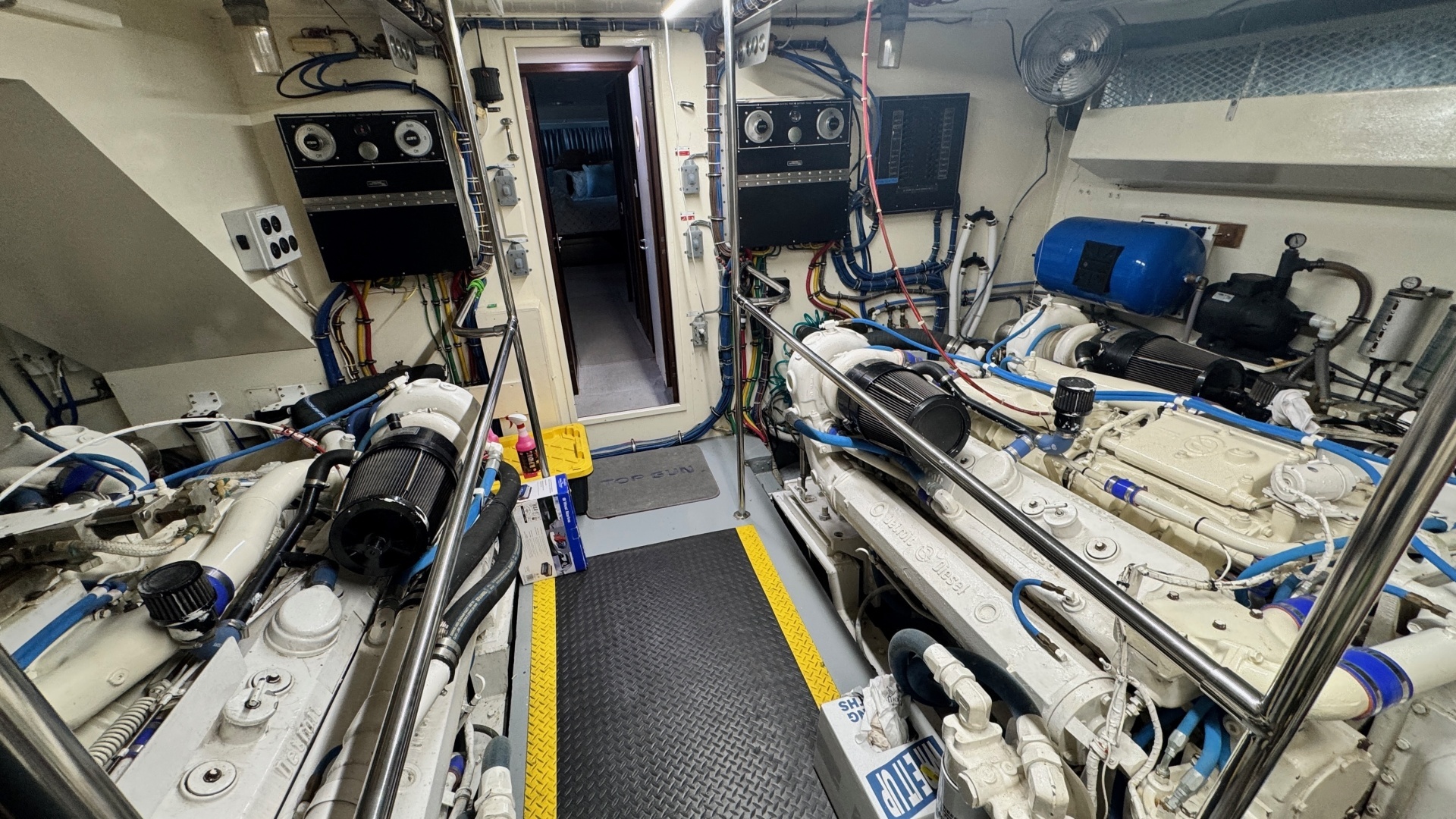 On the main deck forward you find the fully equipped flush-deck pilot house offering port and starboard entry doors and a custom stainless spiral stair up to the flybridge and stairwell down to the guest accommodations. The pilothouse feature new Garmin navtronics and a Starlink Wi-Fi system. Continuing aft on the main deck is a totally updated galley with newer appliances and a teak dinette table to starboard. Aft of the galley is a spacious main salon with a dining table to port and a walk-up bar to starboard. Aft in the main salon is the seating area with L-shaped sofa and two occasional chairs. A door aft in the main salon provides access to the aft deck where you will find a walk up bar to starboard and a L-shaped settee and teak cocktail table to port. A ladder aft on the aft deck provides access to the swim platform.
