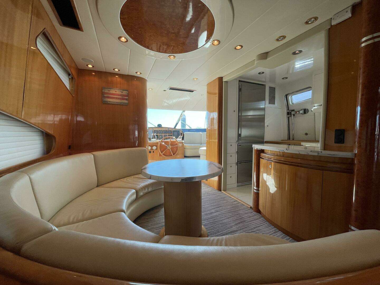 Once on the bridge you will find to port, a large wet bar with beverage refrigerator, icemaker, sink and undercounter storage. A large TV is mounted in this area as well. To starboard is an S-shaped dinette with a high gloss varnished custom hi-lo table.