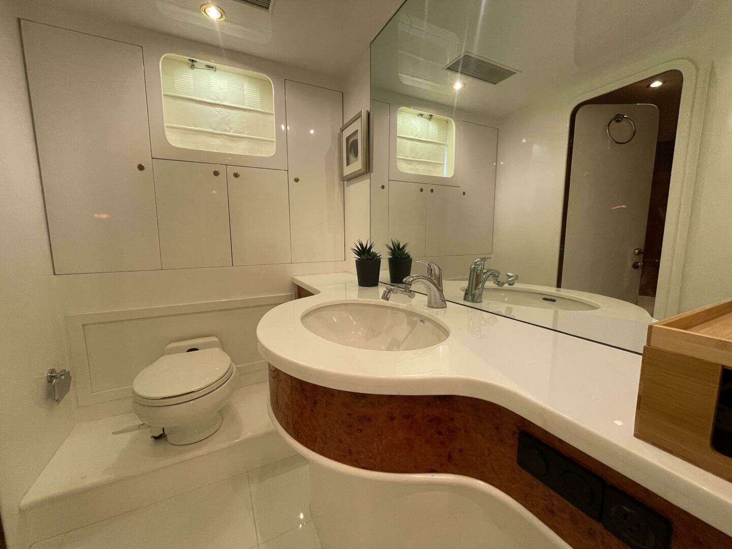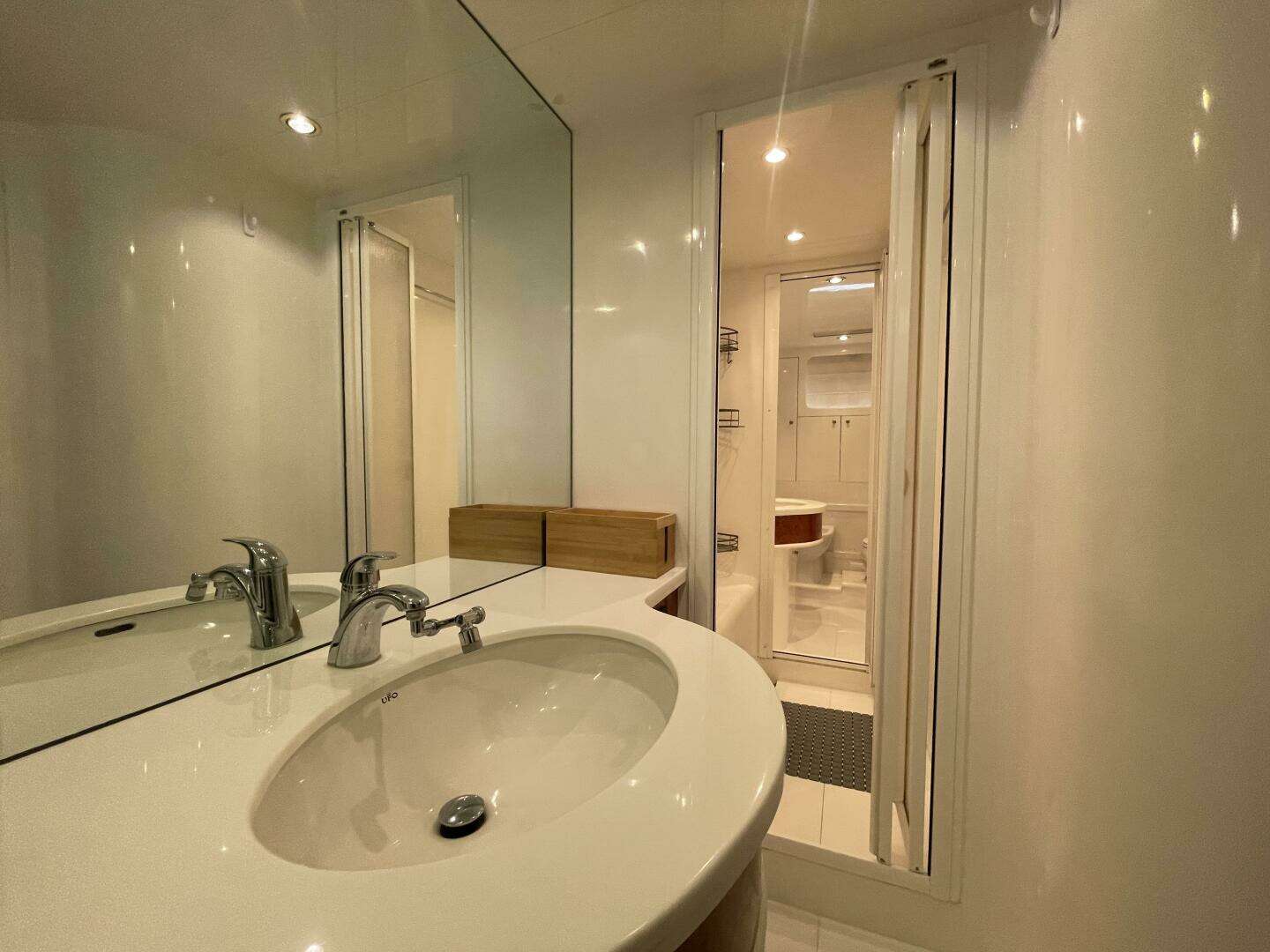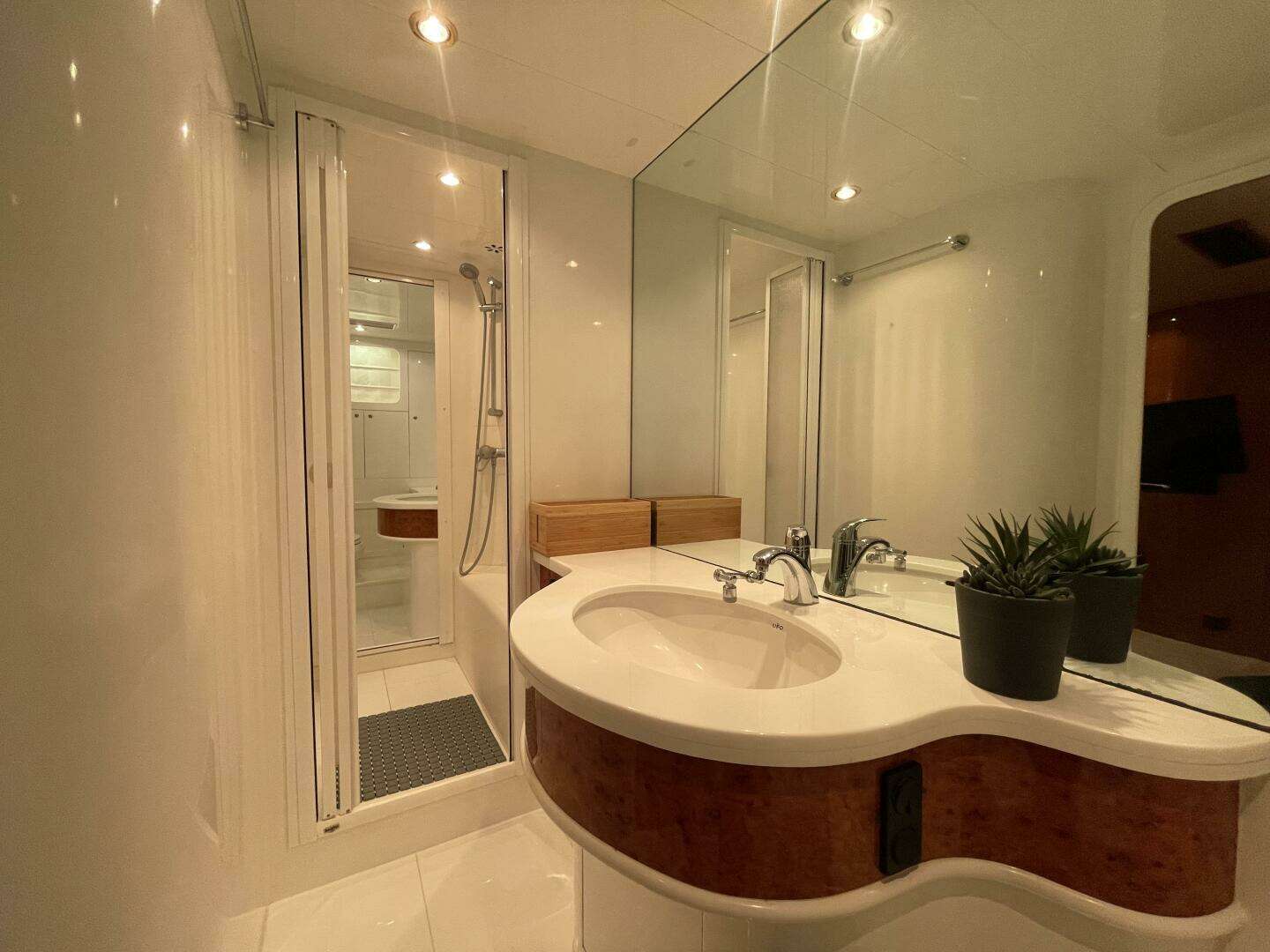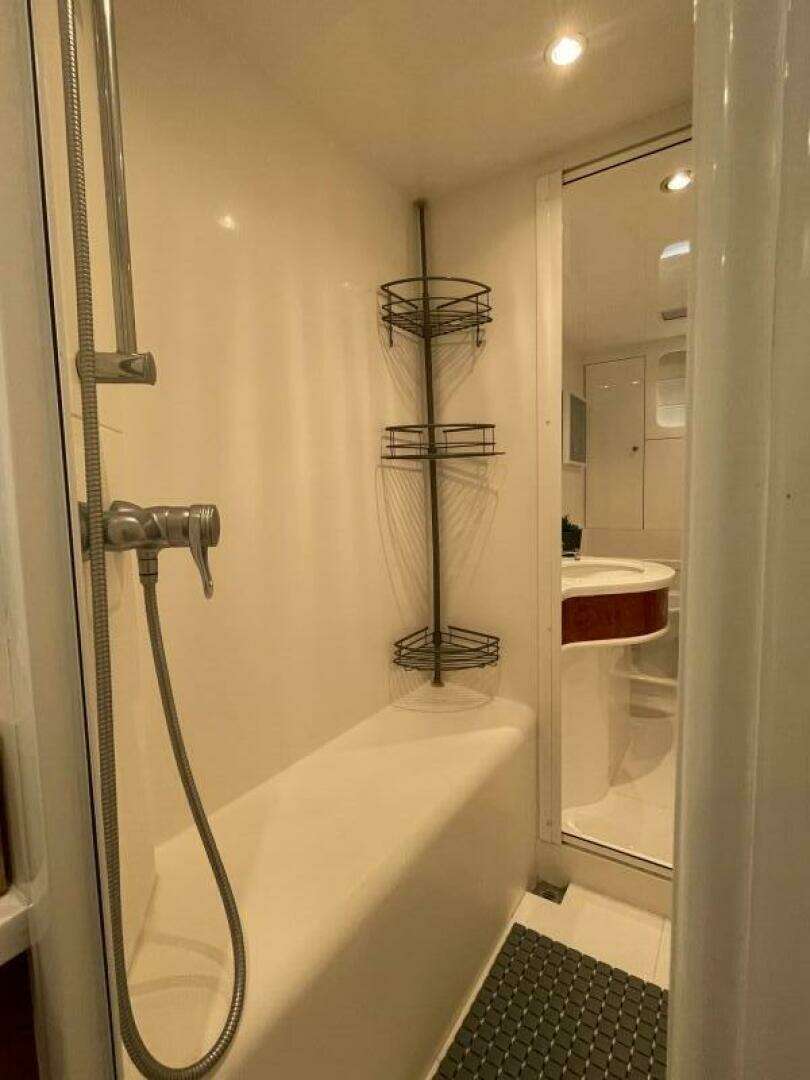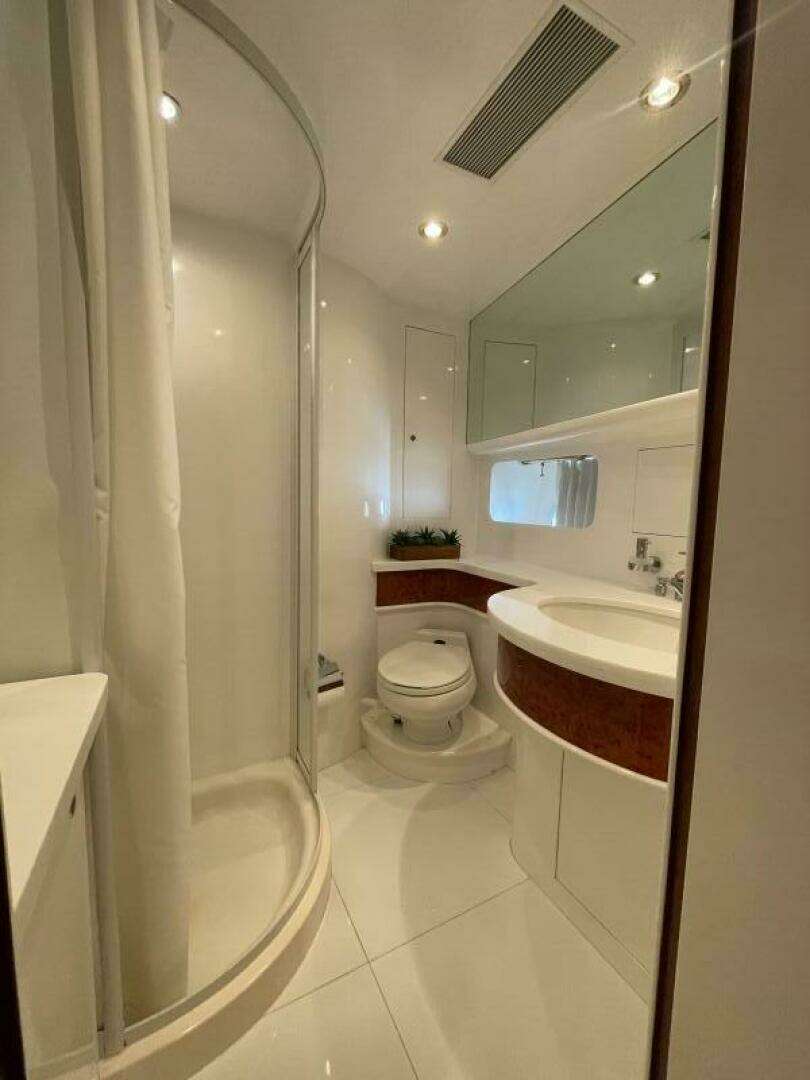 - Port and Starboard heads separated by large stall shower