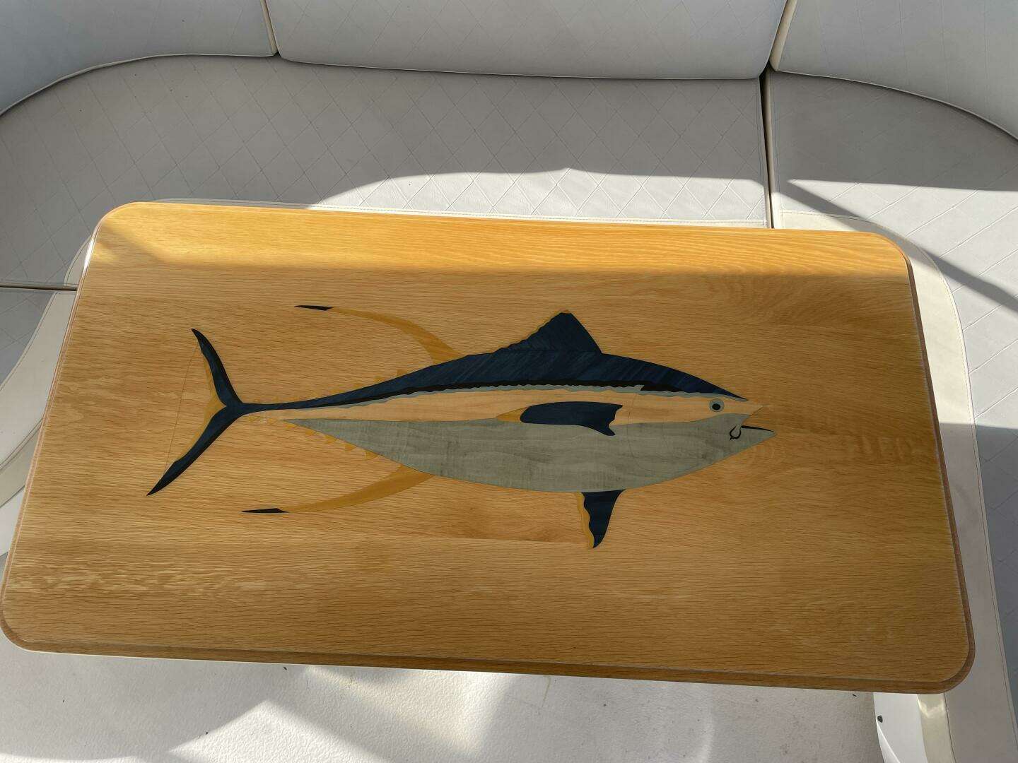 - Built-in aft lounge settee for ( 8 ) with varnished teak hi-lo table
