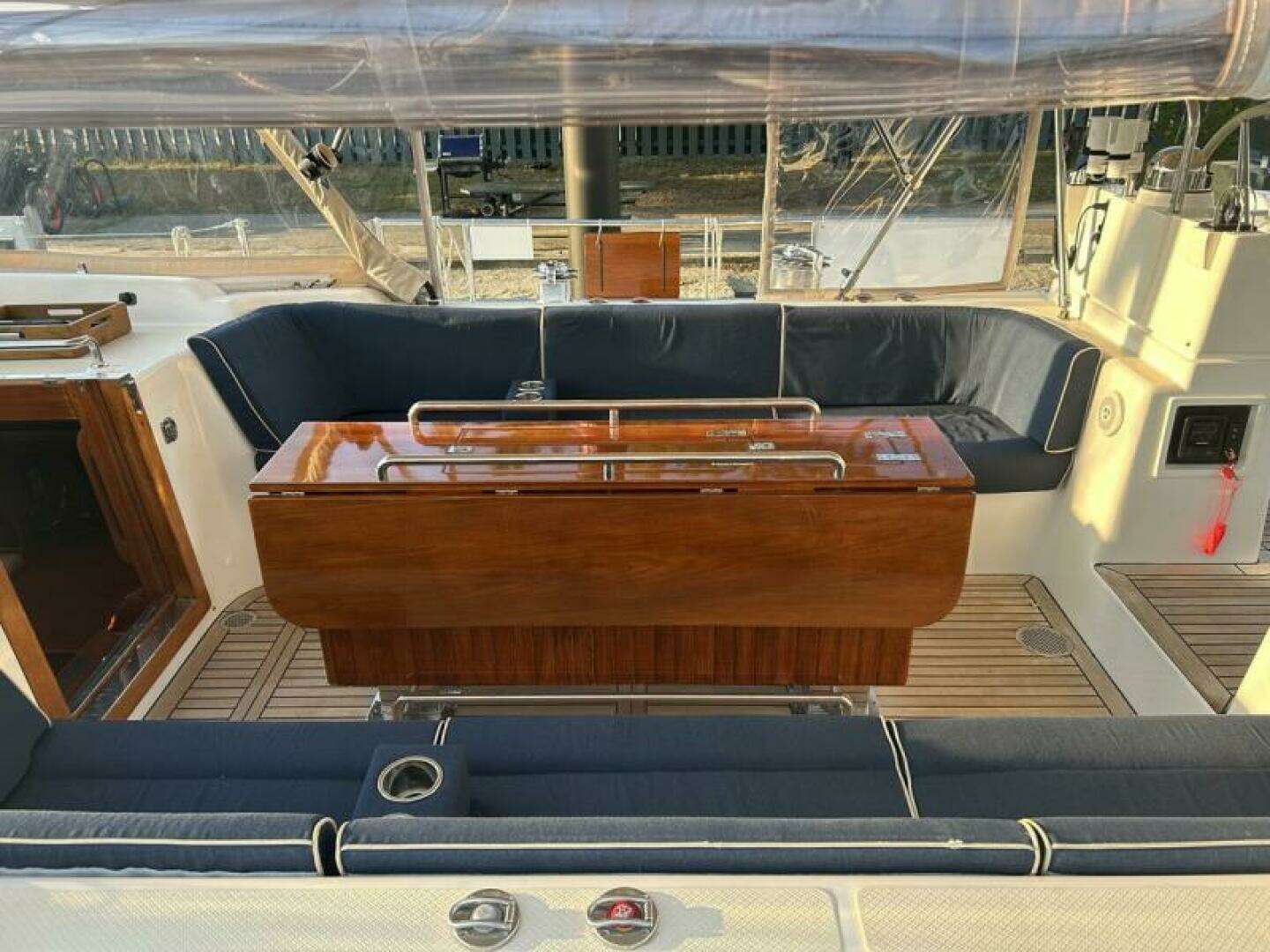 - Varnished teak cockpit table and companionway trim