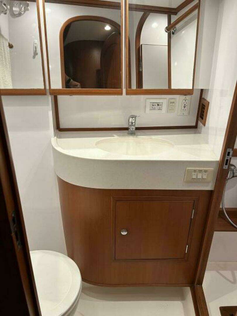 A private head with separate shower stall is found along the port side forward and features a Raritan freshwater electric toilet, Corian counters, vanity mirror and linen closet. There are two opening portholes.