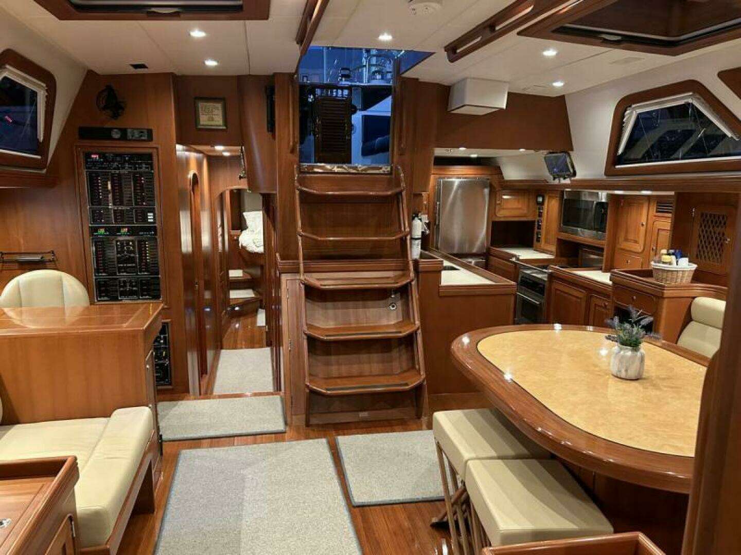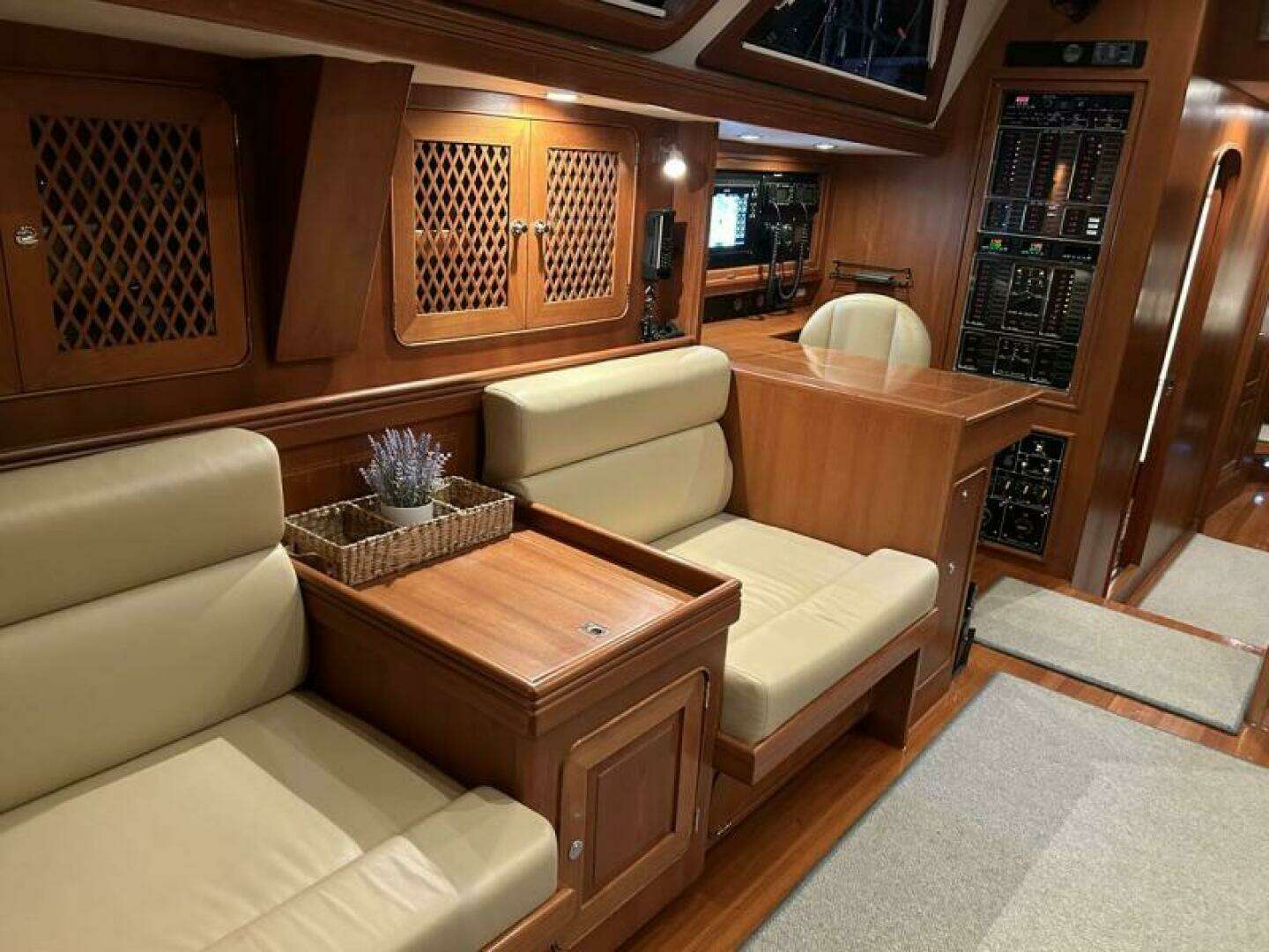 Aft and to starboard is an L-shaped forward facing navigation station with easy access to the cockpit. There is a comfortable pedestal chair along with multiple built-in backlit switch panels, navigation instruments and remote-control panels for the watermaker, system monitors and tank levels. The workspace also includes a lift-up chart table with custom storage and filing drawer, and a new safe was installed 2024.