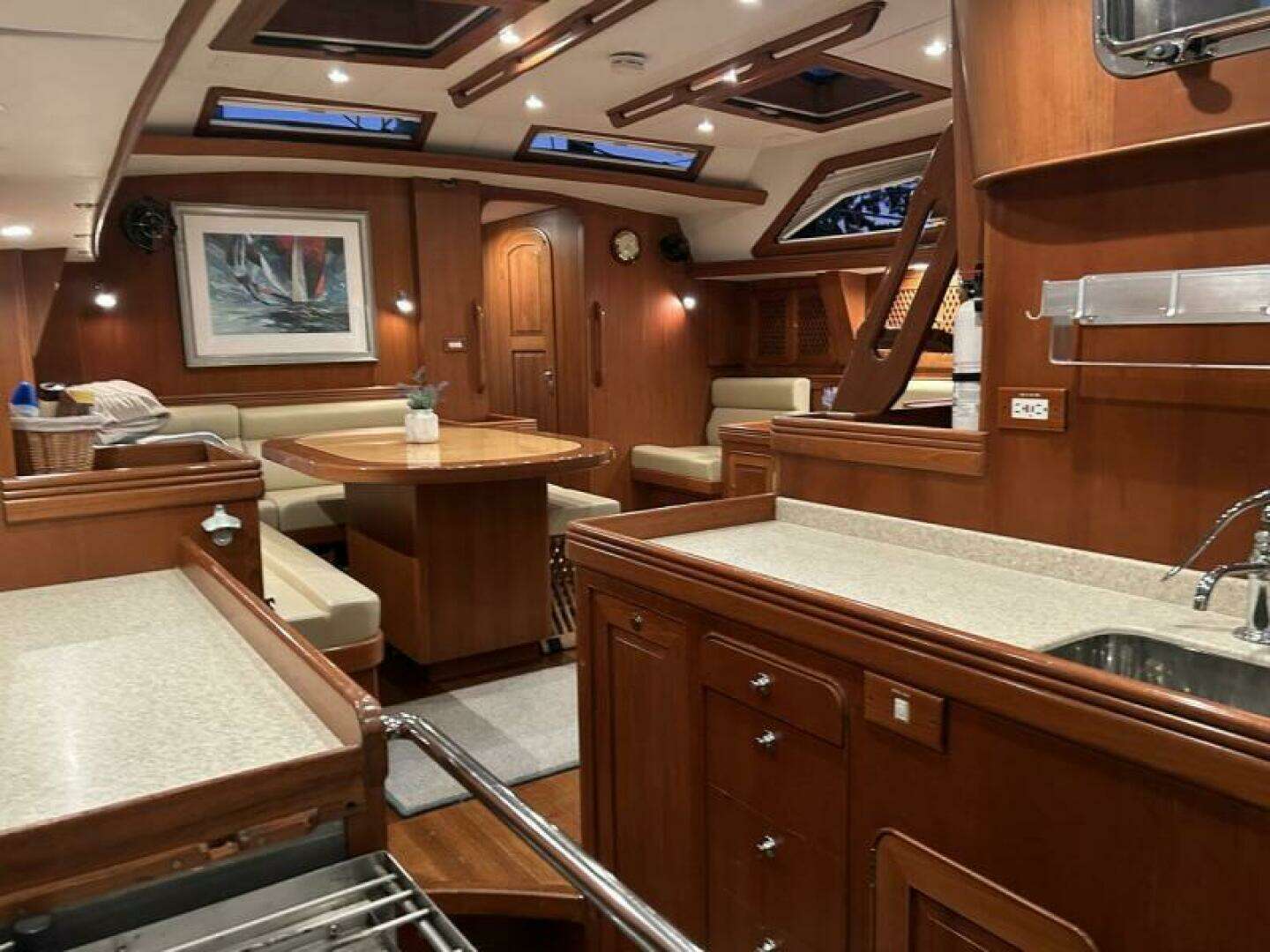 - All new belowdecks Ultraleather salon upholstery and cushions at settee, folding dining stools, starboard seats, chart table seat