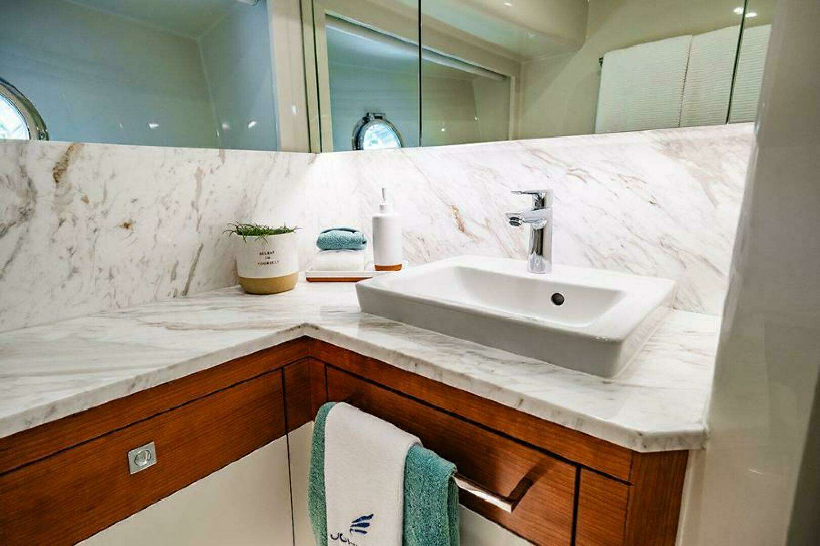 Going forward from the Master is a twin berth cabin to starboard with the option of sliding the two berths together. Opposite to port is a guest head and a second twin berth cabin with fixed bunks. All the way forward is a VIP cabin with a walk-around queen berth and a private head.