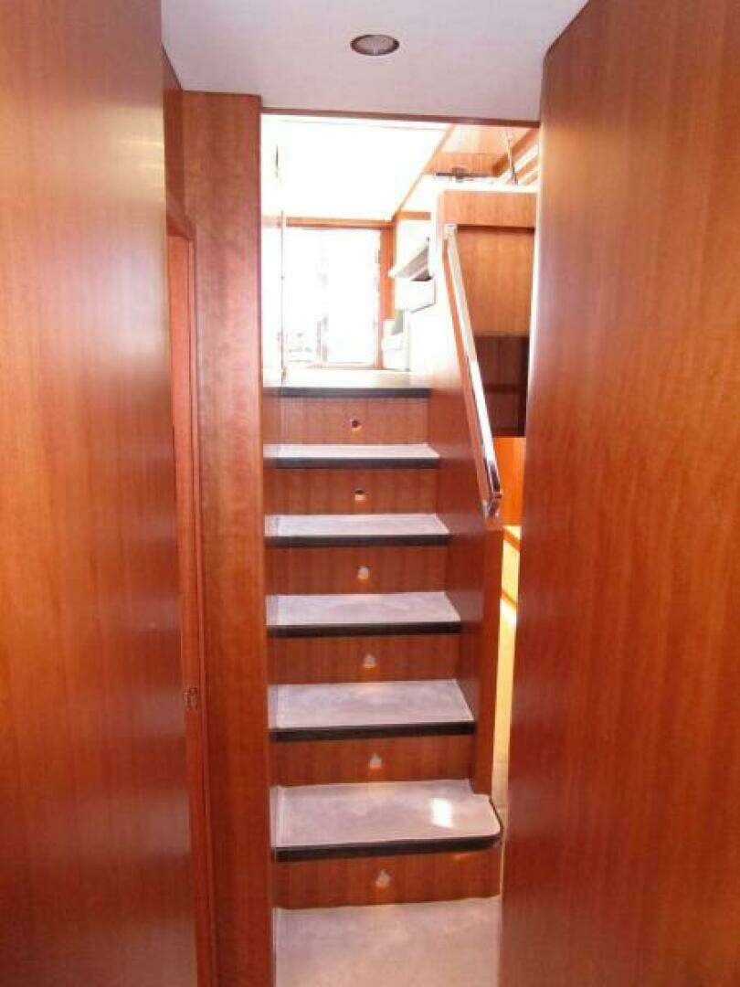Centerline is a stairway leading to the four guest cabins. The Master is aft with a king size berth in the full beam stateroom. The Head and hanging locker are aft of the Master berth.