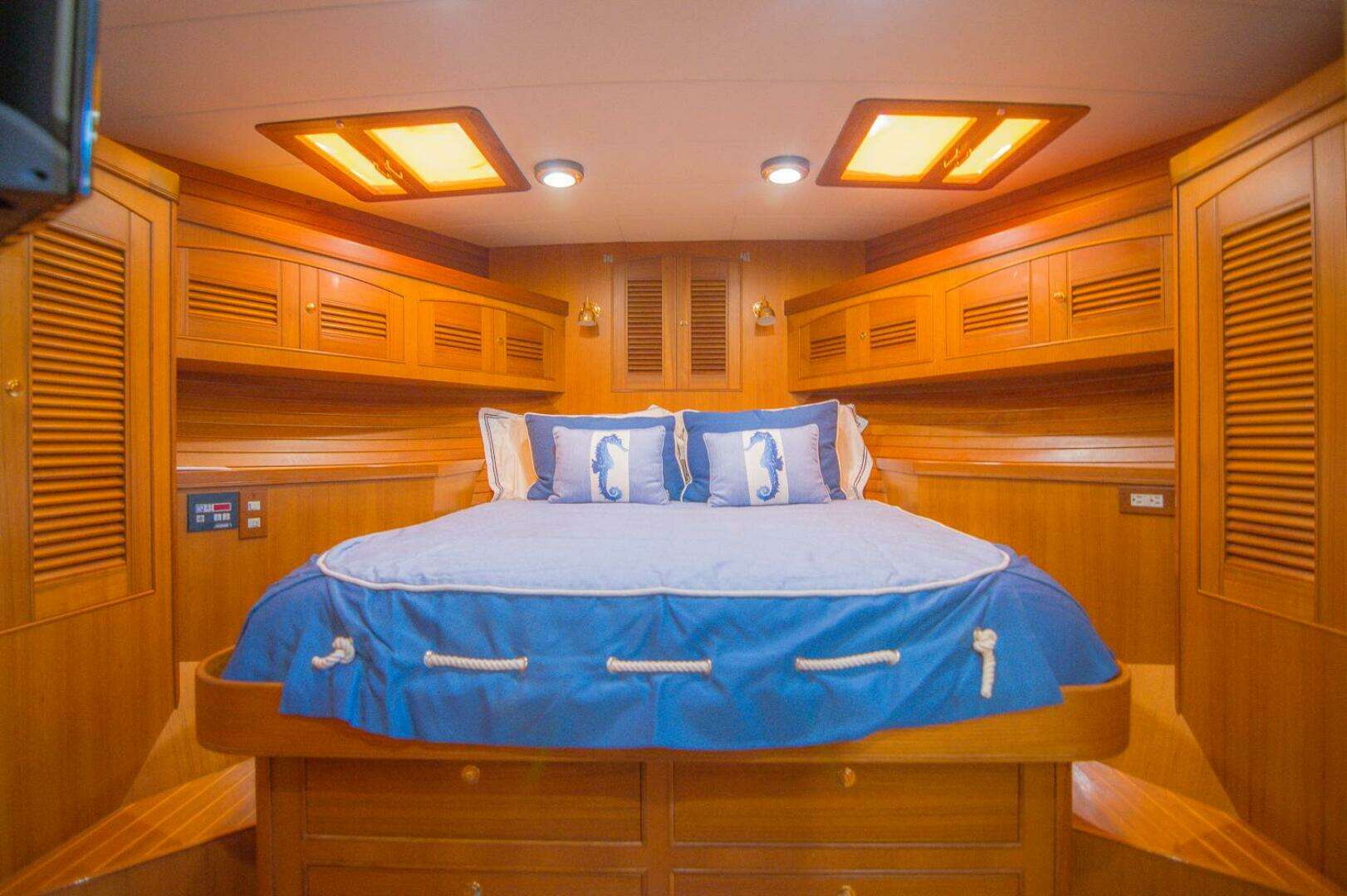 The full beam master is huge with full 6'4" headroom, teak and holly sole highlighting the teak interior. She has an island king berth with drawer storage under the berth in addition to dressers port and starboard. There are portlights with Shoji screens, night lighting around the berth as well as behind the valances. The master stateroom offers a lady’s vanity table with mirror and swing-out seat. The en-suite his and hers head is spacious with a large shower room in between two sink vanities with granite countertops and several drawers and lockers with shelves for storage of toiletries, linens, etc.
